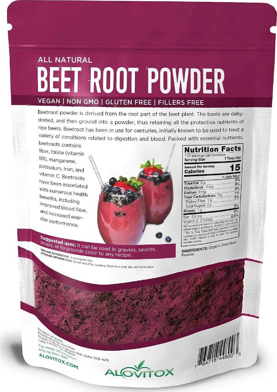 - NATURAL NITRIC OXIDE SUPPLEMENT Our Beetroot Powder is tied with essential nutrients such as fiber, foliate& vitamin C. Alovitox organic beet root powder is suitable for your general health. Our vitamin C powder contains excellent antioxidants & also helps support heart health, mental clarity, focus, promoting faster-wound healing, and a lot more.