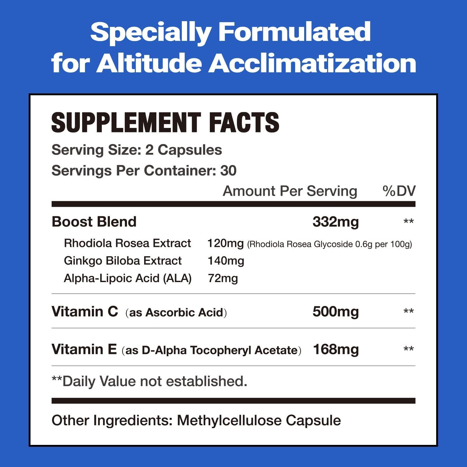 - ALTITUDE SICKNESS PREVENTION: Each serving contains Ginkgo biloba extract 140mg, Rhodiola rosea extract 120mg (Rhodiol glycosides 0.6g/100g), Alpha Lipoic Acid (ALA) 72mg. It improves the oxygen-carrying capacity of hemoglobin, thus preventing discomfort that may be caused by high altitude exercise, such as fatigue, headache and breathing difficulties.