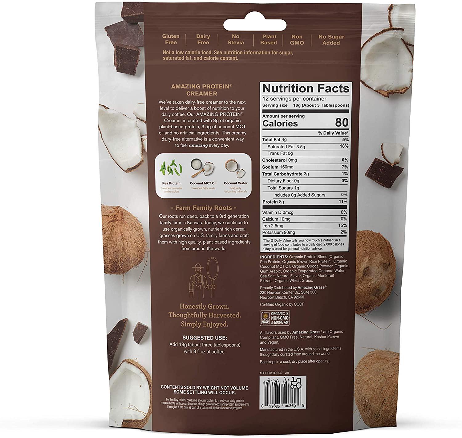 - Amazing Grass Dark Chocolate Creamer is a delicious fuel that delivers more nutrition than typical creamers and has no artificial ingredients.