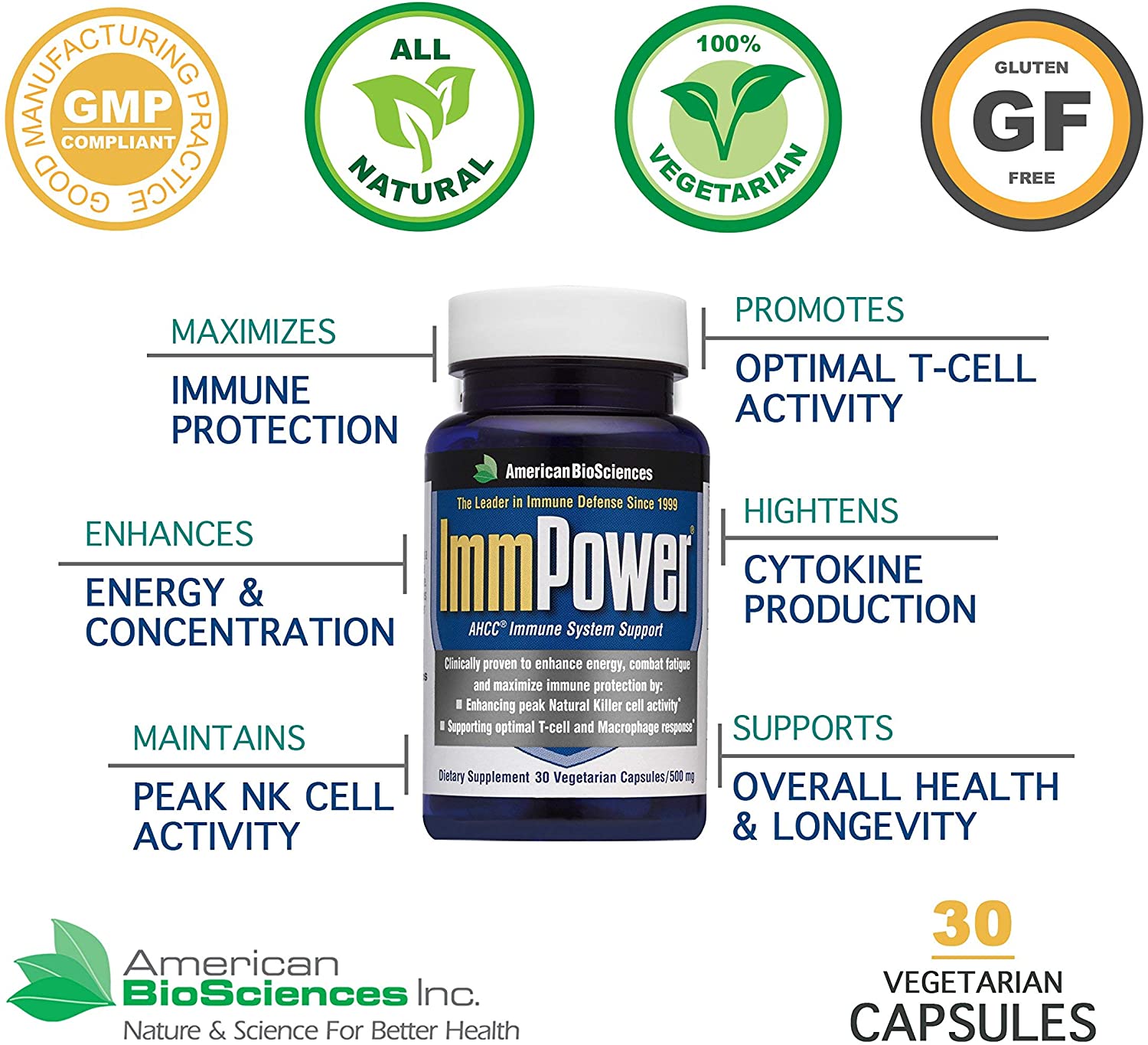 American BioSciences ImmPower AHCC Supplement, Enhanced Immune Support, Natural Killer Cell Activity and Cytokine Production, 30 Vegetarian Capsules, 500 milligrams per Capsule
