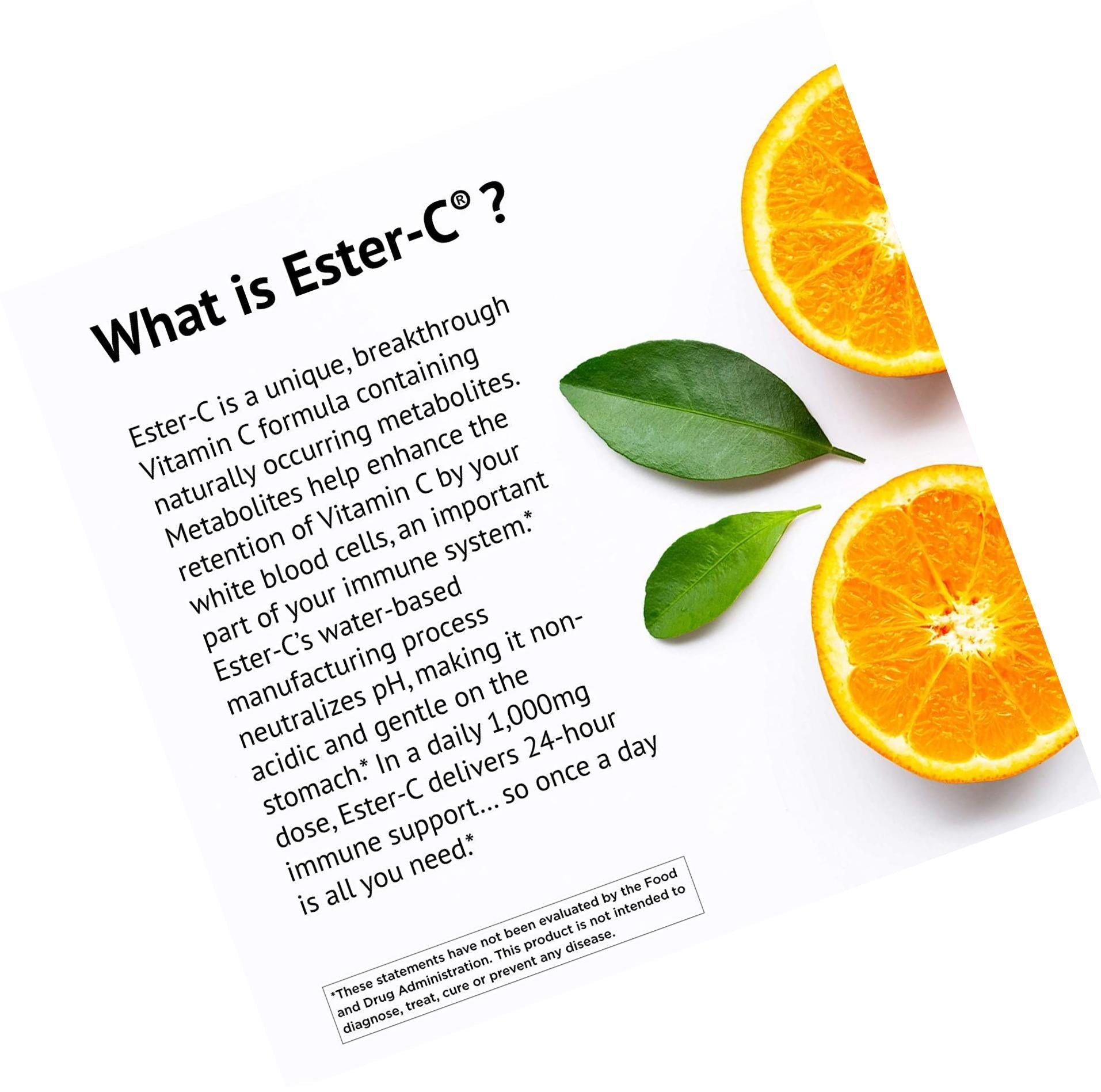 Ester-C 1000 mg with Citrus Bioflavonoids 90 CapsuleProduct DescriptionEster-C is a breakthrough patented Vitamin C formula supported with naturally occurring metabolites. Metabolites help enhance the absorption of Vitamin C by your white blood cells, an important part of your immune system.* Ester-C's unique, chemical-free manufacturing process neutralizes pH, making it non-acidic and gentle on the stomach.* In a daily 1,000 mg dose, Ester-C delivers 24-hour immune support...so once a day is all you need.* Added Citrus Bioflavonoids may help your body better absorb and utilize Vitamin C.24-Hour Immune SupportGentle on the StomachTake Once DailyPatented Vitamin C Formula