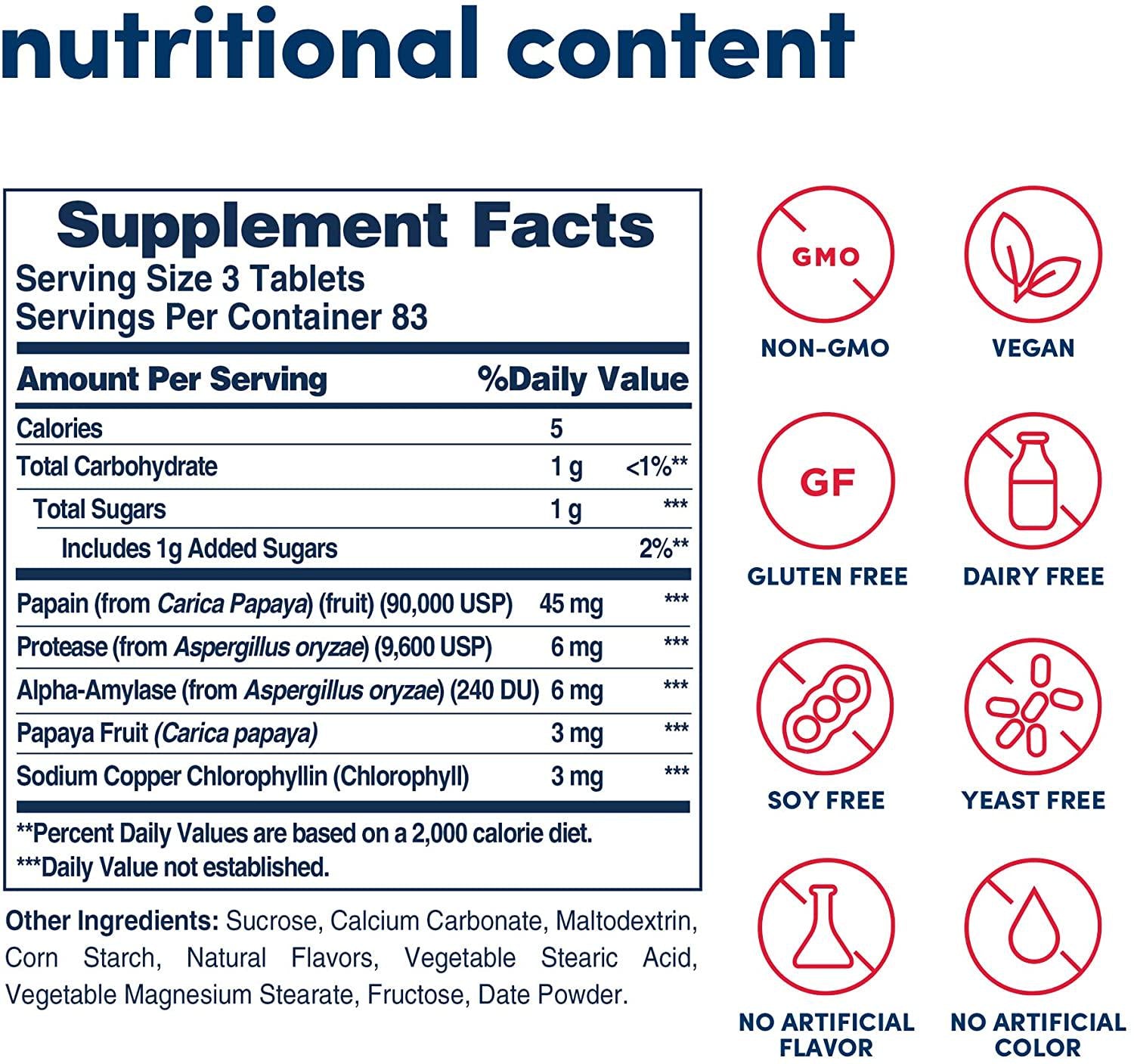 Papaya Enzyme With Chlorophyll 250 ChewableProduct Descriptions:Our famous blend with Chlorophyll is the perfect after meal supplement to help support and maintain daily digestive health.* We combine the finest quality of freshly ripened Papaya fruit with papain, amylase and protease enzymes which aid in the digestion of proteins and carbohydrates, while encouraging proper nutrient absorption.* Our formula offers the ideal choice to help with inefficient digestion.* Take this delicious papaya enzyme regularly to promote gastrointestinal wellness while helping to reduce bad taste and sweeten breath.*The After Meal Supplement100% Natural Digestive Enzyme Helps With Inefficient DigestionPromotes Nutrient AbsorptionGreat Tasting,Vegetarian FormulaWith Chlorophyll to Freshen Breath and Reduce Bad TasteSuggested Use As a dietary supplement For adults, chew three (3) tablets following a meal, one to three times daily, or dissolve one (1) or two (2) tablets in mouth when needed. - Or as directed by your healthcare professional.Supplement FactsServing Size: 3 TabletsServings Per Container: 83Amount Per Serving% Daily Value***Total CarbohydratesSugars**Papain (from Carica papaya) (fruit)45 mg**Protease (from Aspergillus Oryzae)6 mg**Alpha-Amylase (from Aspergillus Oryzae)6 mg**Papaya Fruit (Carica Papaya)3 mg**Chlorophyll (from Alfalfa)3 mg*****Percent Daily Values are based on a 2,000 calorie dietOther Ingredients: Surose, Calcium carbonate, Vegetable Stearic Acid, Vegetable magnesium stearate, Corn starch, Papaya flavor, Date powder, fructose.Does Not Contain: No Gluten No Yeast No Wheat No Milk or Milk Derivatives No Lactose No Soy No Eggs No Grapefruit No Preservatives No Artificial Color No Sodium Suitable for VegetariansWarnings: Keep out of reach of children. As with all dietary supplements, consult your healthcar