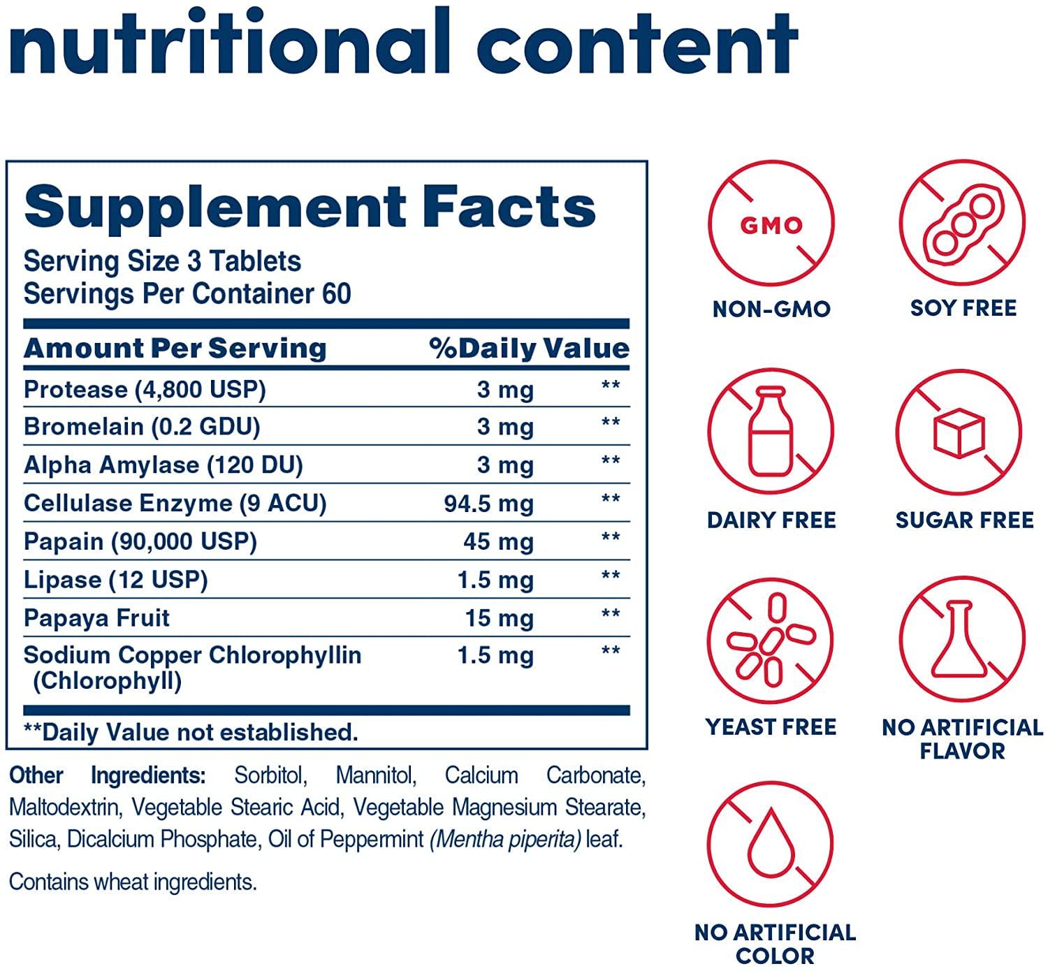 Super Papaya Enzyme Plus 180 ChewableProduct Description:An advanced, more powerful digestive aid, our award-winning after-meal supplement contains 100% natural enzymes and may be especially helpful when looking for a higher level of support to help with inefficient digestion.* Each serving contains 15 mg of delicious papaya fruit fortified with well-known enzymes, including papain, protease, amylase and bromelain, which encourages proper nutrient absorption and aids in the digestion of proteins, carbohydrates and fats.* Peppermint and Chlorophyll are added to help reduce bad taste and sweeten breath.The After Meal Supplement100% Natural Digestive Enzyme Helps With Inefficient DigestionPromotes Nutrient AbsorptionGreat Tasting, High-Potency FormulaWith Chlorophyll & Peppermint to Freshen BreathSuggested Use As a dietary supplement For adults, chew three (3) tablets following a meal, one to three times daily, or dissolve one (1) or two (2) tablets in mouth when needed. - Or as directed by your healthcare professional.Supplement FactsServing Size: 3 TabletsServings Per Container: 60Amount Per Serving% Daily Value***Protease (60 HU/mg)3 mg**Bromelain (0.160 GDU/mg)3 mg**Alpha Amylase (40 SKBU/mg)3 mg**Cellulase Enzyme (4 C-1-ASE/mg)3 mg**Papain (6,000 USP Units/mg)45 mg**Lipase (8 USP Units/mg)1.5 mg**Papaya Fruit1.5 mg**Chlorophyll1.5 mg*****Percent Daily Values are based on a 2,000 calorie dietOther Ingredients: Sorbitol, Mannitol, Calcium Carbonate, Vegetable Stearic Acid, Vegetable Magnesium Stearate, Silica, Oil of Peppermint (Mentha piperita) (leaf).Does Not Contain: No Gluten No Yeast No Wheat No Milk or Milk Derivatives No Lactose No Soy No Eggs No Grapefruit No Sugar No Preservatives No Artificial Color No Artificial Flavor No SodiumWarnings: Keep out of reach of children. As with all dietary supplements,