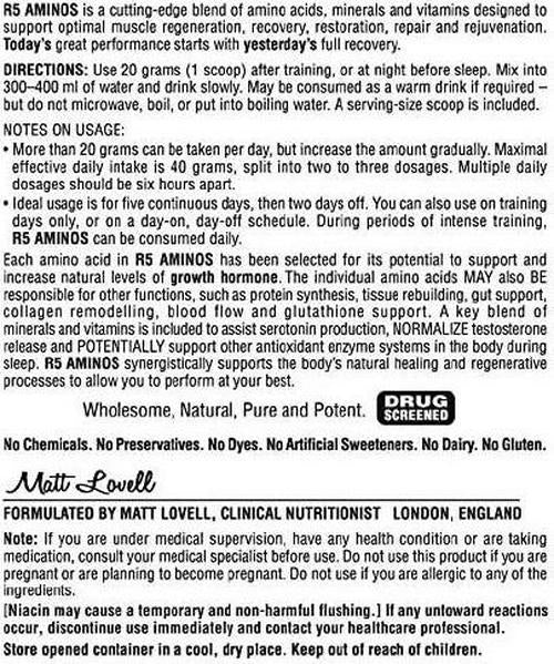 - Developed by UK registered nutritionist Matt Lovell, R5 Aminos from Amino Man has been the go to supplement for fast recovery and restful sleep for many years.