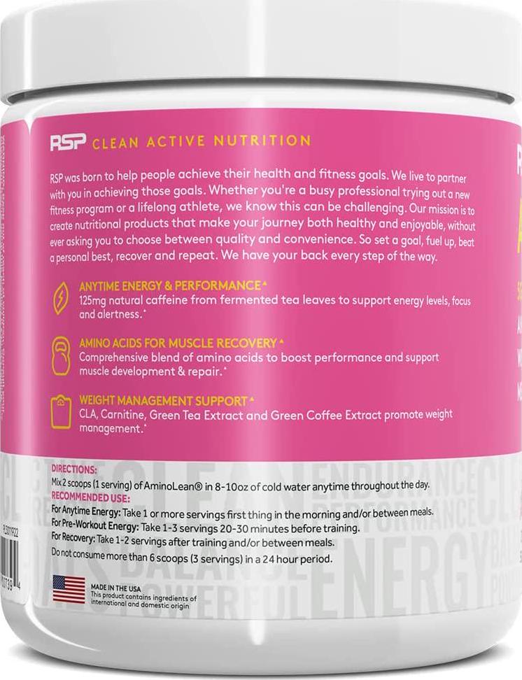 AminoLean is the ideal pre workout, weight management, and amino energy solution for those looking for a great pre workout powder or any time energy solution that delivers real results. Using select ingredients from natural, healthy sources such as Green Tea Extract and Green Coffee Bean, AminoLean features an energy blend that can provide a boost of sustained clean energy and enhanced mental focus pre workout or any time of the day. By blending the recovery power of Essential Amino Acids and BCAAs with the natural weight management benefits of CLA and L-Carnitine, AminoLean can also help you build lean muscle, manage your weight, and recover faster. Enjoy extraordinary versatility with AminoLean by customizing your serving size from 2 scoops up to 6 scoops to cater to your specific energy needs. Use it as a pre workout powder, afternoon pick-me-up, or a replacement for your morning coffee; without any of the unwanted jitters. AminoLean mixes easily and comes in a variety of delicious flavors. Best of all, AminoLean contains zero carbs, zero sugars, and zero calories, making it a true clean all-in-one preworkout powder, weight management, and amino energy supplement for all active individuals. *AminoLean does not contain any gluten in its ingredients - but there may be trace amounts due to processing environment.