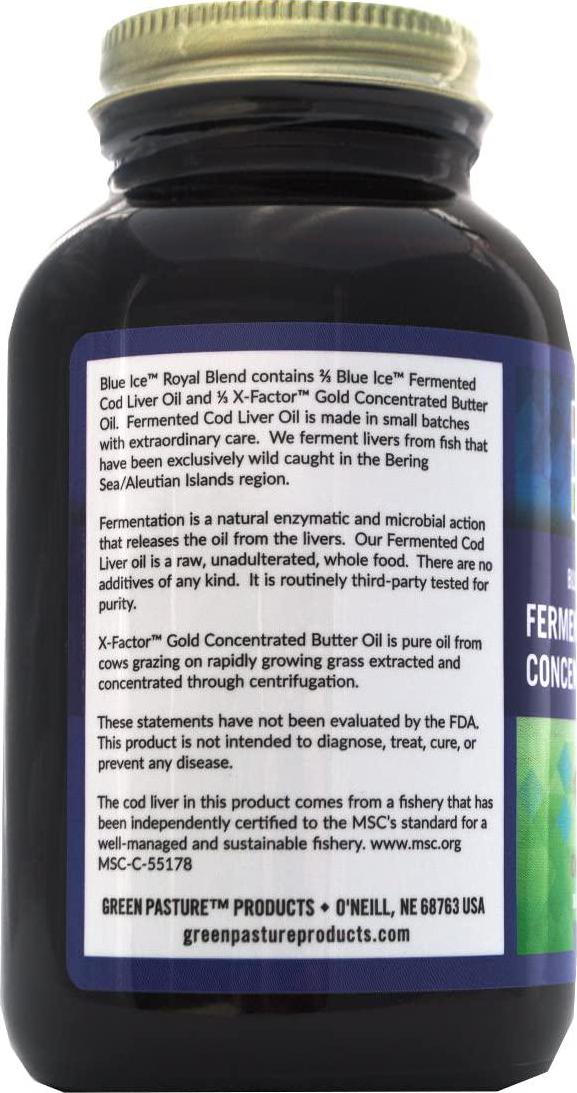 Dr. Weston A. Price discovered High Vitamin Butter Oil in the 1930's. The pinnacle of his X-Factor discovery was the extreme synergistic effect between High Vitamin Butter Oil and traditional cod liver oil. "One without the other did not do his patients justice, but the two together worked magic". X-Factor GoldTM High Vitamin Butter Oil is made from dairy oil extracted without heat from cows that eat 100% rapidly growing grass. The speed of the grass growth, timing of the grazing of this grass, species of grass, climate and extraction method are all important to make real X-Factor GoldTM High Vitamin Butter Oil. The Blue IceTM Fermented Cod Liver Oil brings us back in time, when cod liver oil was truly a sacred food. The Blue IceTM Fermented Cod Liver Oil is lacto-fermented and extracted without heat. The fish are wild caught in the Arctic region. The combination of these attributes provides our community with a pure, clean and nutrient rich sacred food. Blue IceTM Royal offers our community a nutrient dense sacred food blend of 1/3 X-Factor GoldTM High Vitamin Butter Oil and 2/3 Blue IceTM Fermented Cod Liver Oil.