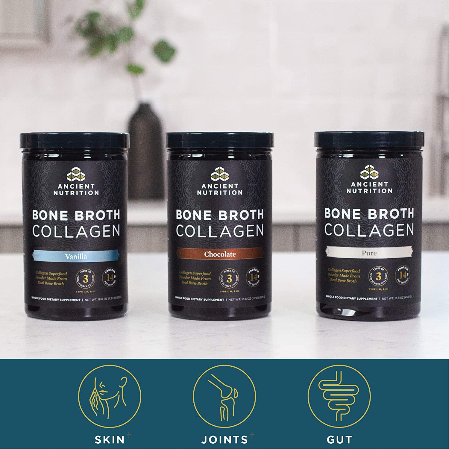 - BURSTING WITH BENEFITS: Ancient Nutrition's Bone Broth Collagen Powder features three types of collagen from three food sources, providing Collagen Type I, II and III from chicken, beef and turkey. Available in decadent chocolate, vanilla, or pure flavor that allows for mixing in your favorite hot or cold beverages.