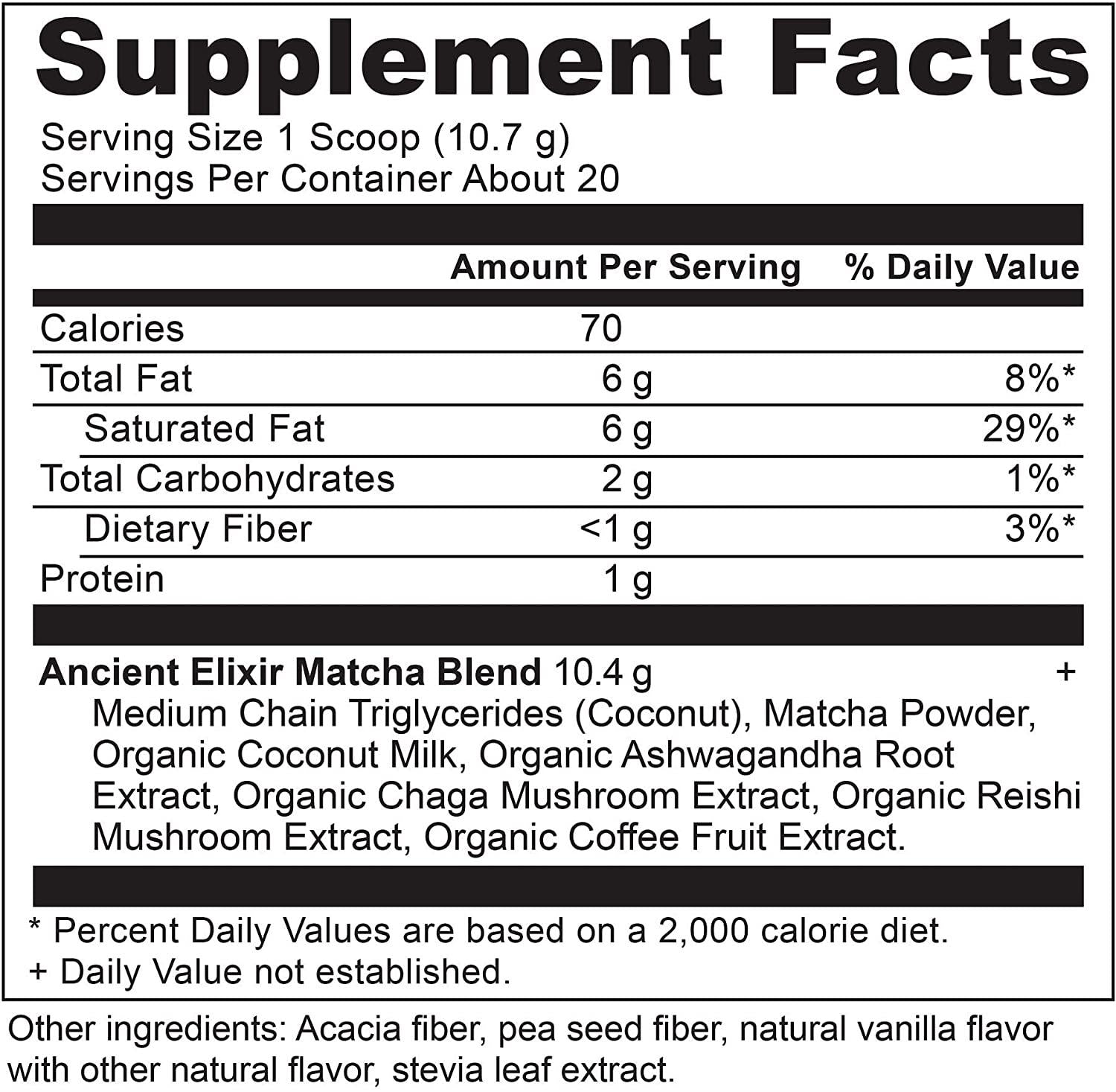- INTRODUCING – Our new KetoMATCHA is an ancient energy elixir fuel by keto-activating coconut MCTs and infused with ancient botanicals, adaptogens and superfoods such as green tea leaf, ashwagandha, reishi, chaga, and coffee cherry.