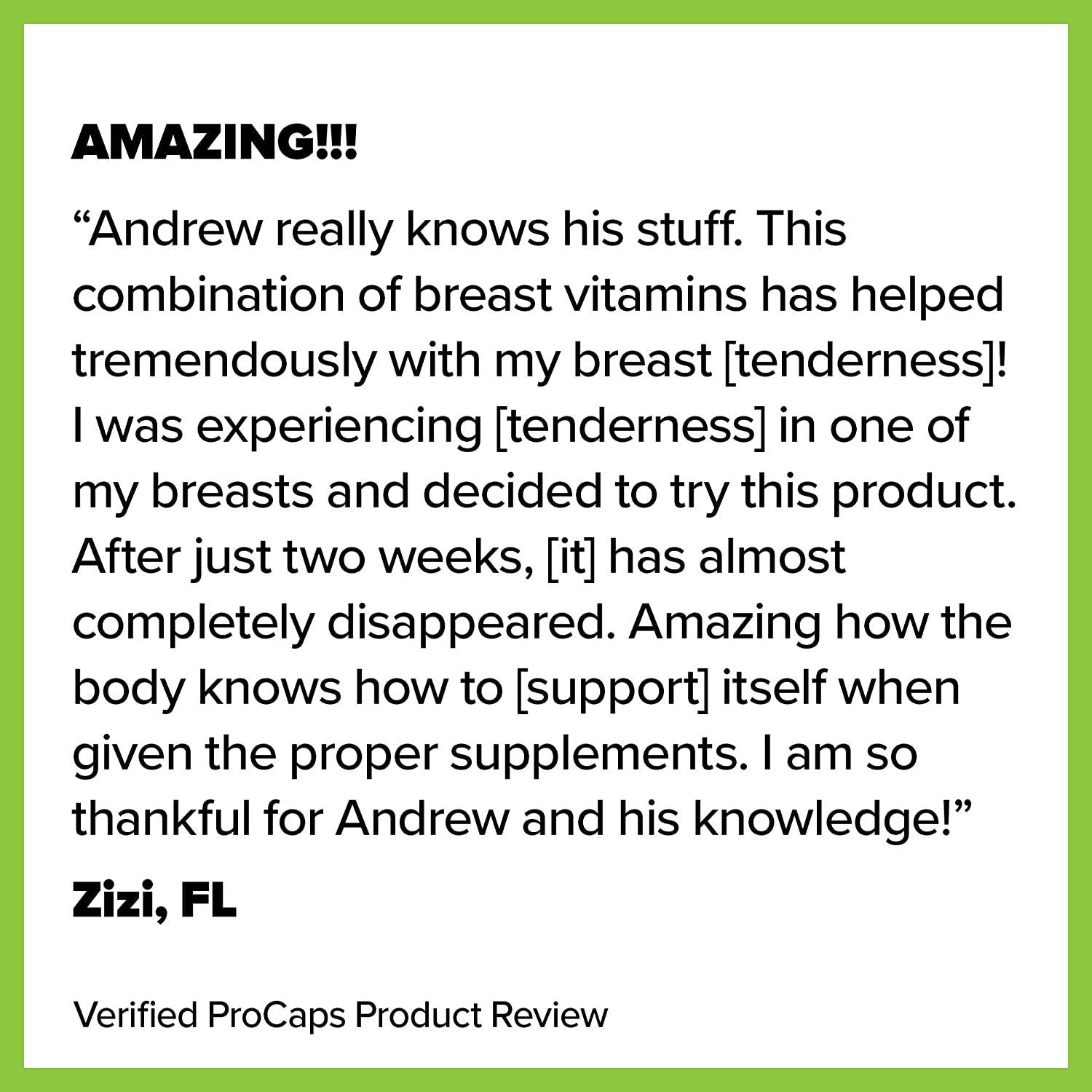 Andrew Lessman's BREAST HEALTH is designed to support the health of the delicate tissues of a woman's breast. This formula provides plant-based protection that targets breast tissue. These protective compounds offer natural support for the healthy structure of the cells that make up this delicate tissue. We start with Indole3-Carbinol, naturally found in cruciferous vegetables (particularly cauliflower), which helps support and maintain the health of the breast along with normal estrogen activity in breast tissue. We then add Sulforaphane, another ingredient from healthy cruciferous vegetables, which, among many beneficial properties, promotes the body's internal production of one of its most important protective compounds - Glutathione. No breast health formula would be complete without the protective properties of our Green Tea Extract, which is standardized to provide high levels of its most important protective polyphenols, including all-important Epigallocatechin Gallate (EGCG). We also add the three protective carotenoids: Lutein, Lycopene and Zeaxanthin, given their high concentration in female reproductive and breast tissue. We also add the additional protection of OPCs (Oligomeric Proanthocyanidins) from our standardized Grape Seed Extract, along with our Turmeric Extract and its standardized Curcumin-Phospholipid Complex. We also support these plant-based ingredients with Vitamins D, C, B12 and Folic Acid. The end result is a comprehensive array of standardized, plant-based ingredients and nutrients that provide unprecedented support for the health of the fragile tissues of a woman's breast.