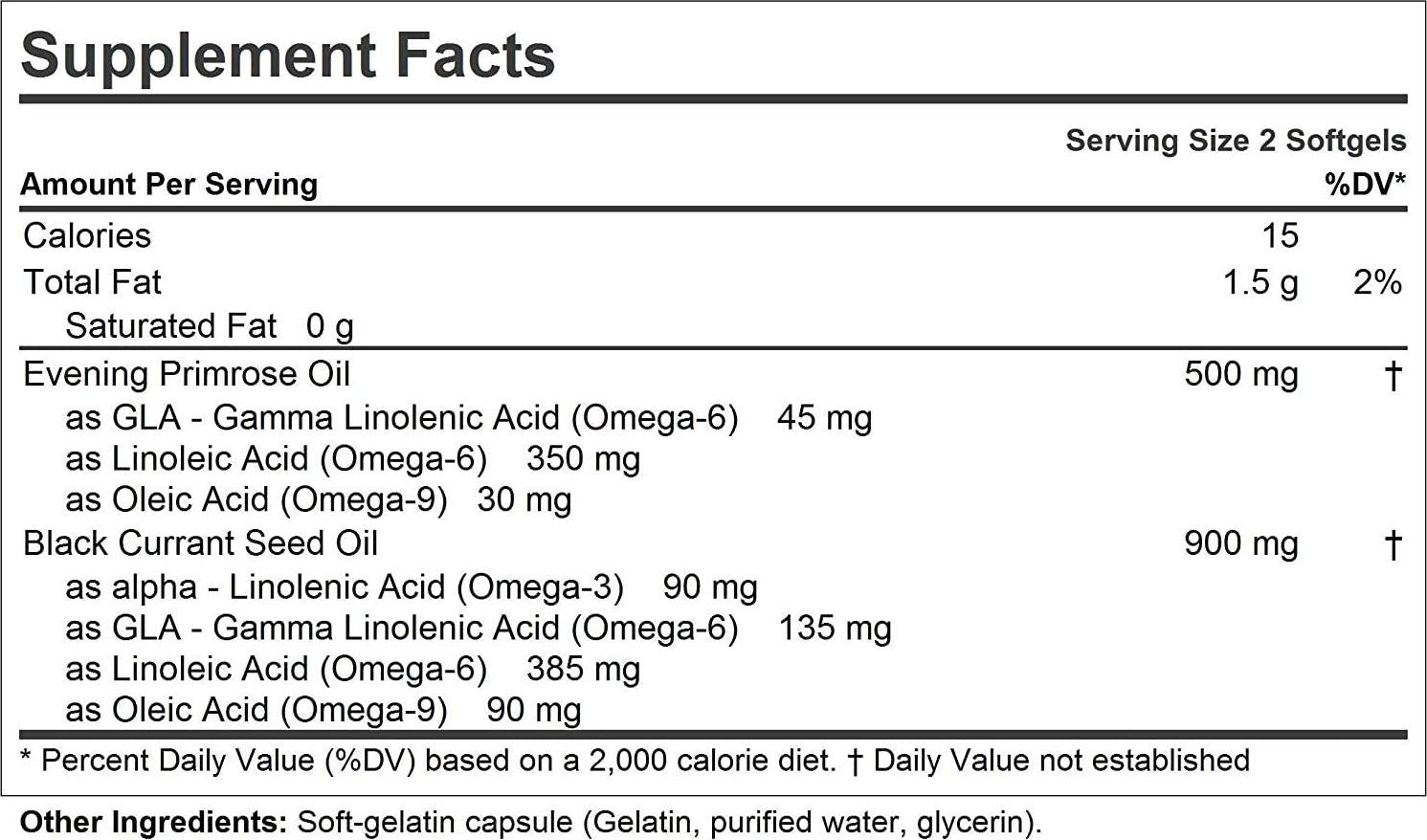 - SUPERIOR 100% PURE BIO-ACTIVE INGREDIENTS Delivers concentrated essential fatty acids from Evening Primrose and Black Current Seed oils. Contains NO Milk /Dairy-Free, Gluten-Free; NO soy, yeast, corn, wheat, sodium, salt, sugar, cholesterol, color, preservative, common allergens or manufacturing additives. 309 chars