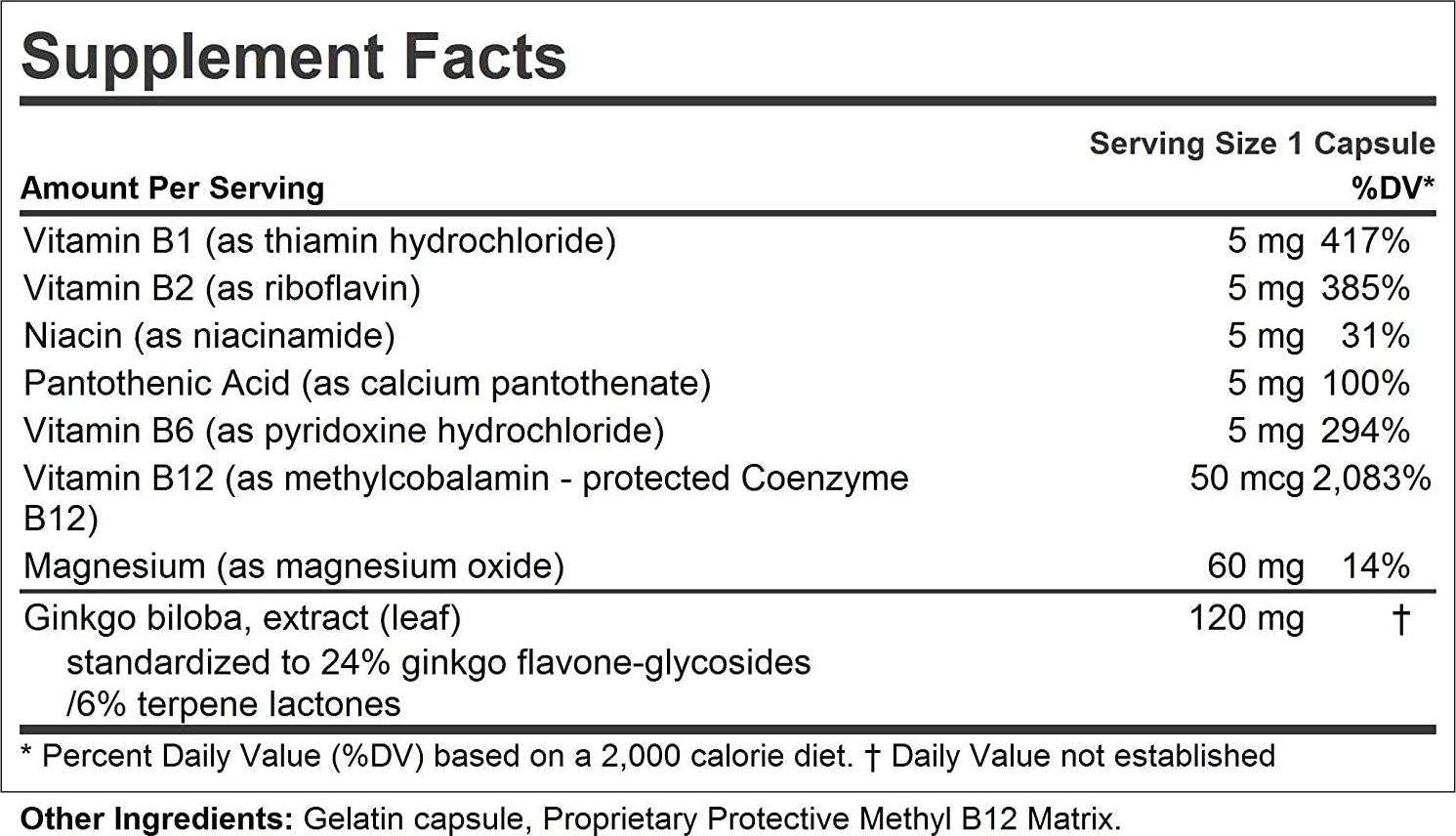 - SUPERIOR 100% PURE BIO-ACTIVE INGREDIENTS – Delivers 120 mg standardized ginkgo biloba, high potency vitamin B-complex and magnesium. Contains NO Milk / Dairy-Free, Gluten-Free; NO soy, yeast, corn, wheat, sodium, salt, sugar, fat, cholesterol, color, preservative, common allergens or manufacturing additives.