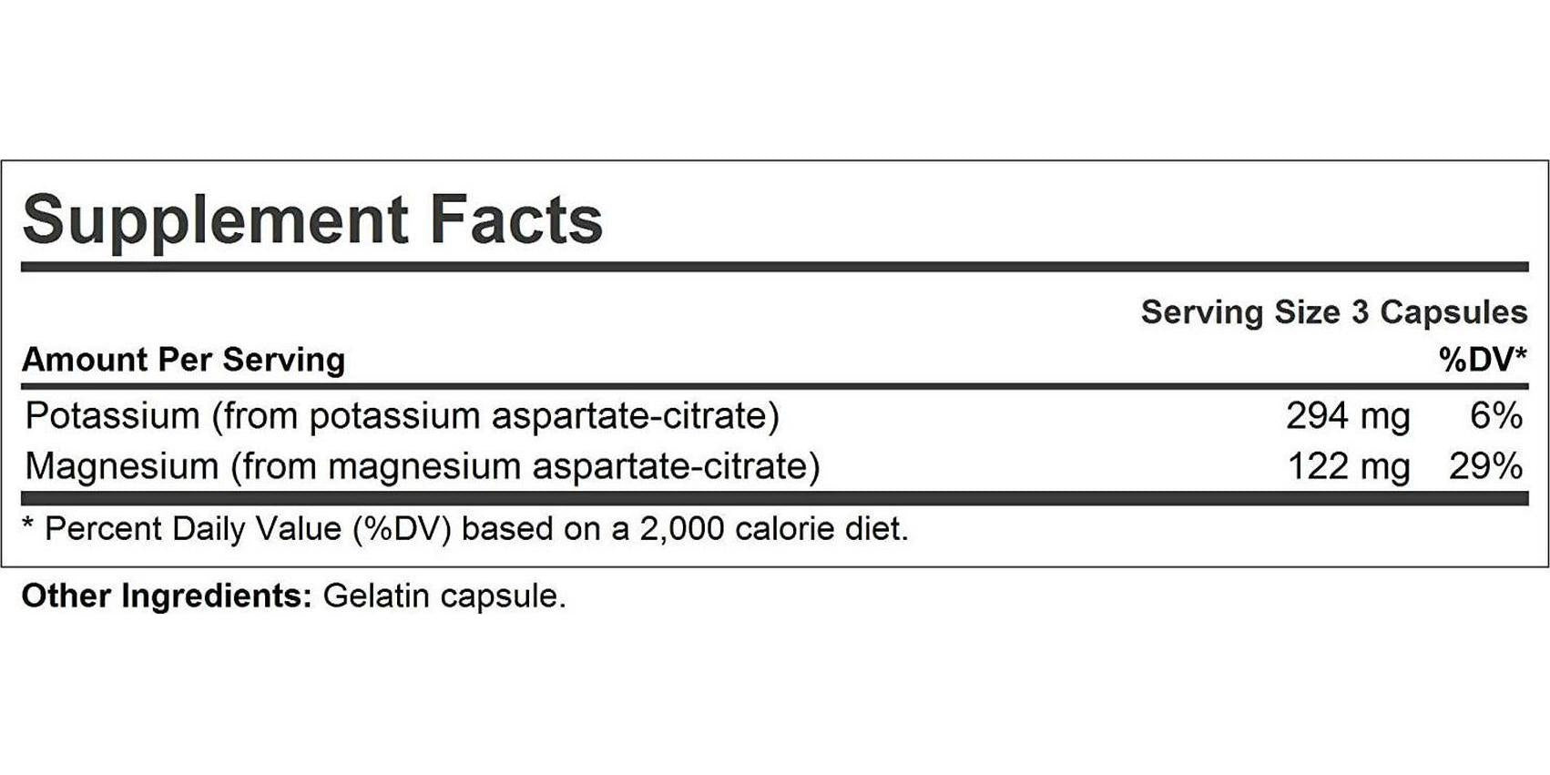 - SUPERIOR 100% PURE BIO-ACTIVE INGREDIENTS – Delivers 2,000 mg Potassium-Magnesium Aspartate-Citrate. Contains NO Milk / Dairy-Free, Gluten-Free; NO soy, yeast, wheat, sodium, salt, sugar, fat, cholesterol, color, preservative, common allergens or manufacturing additives.