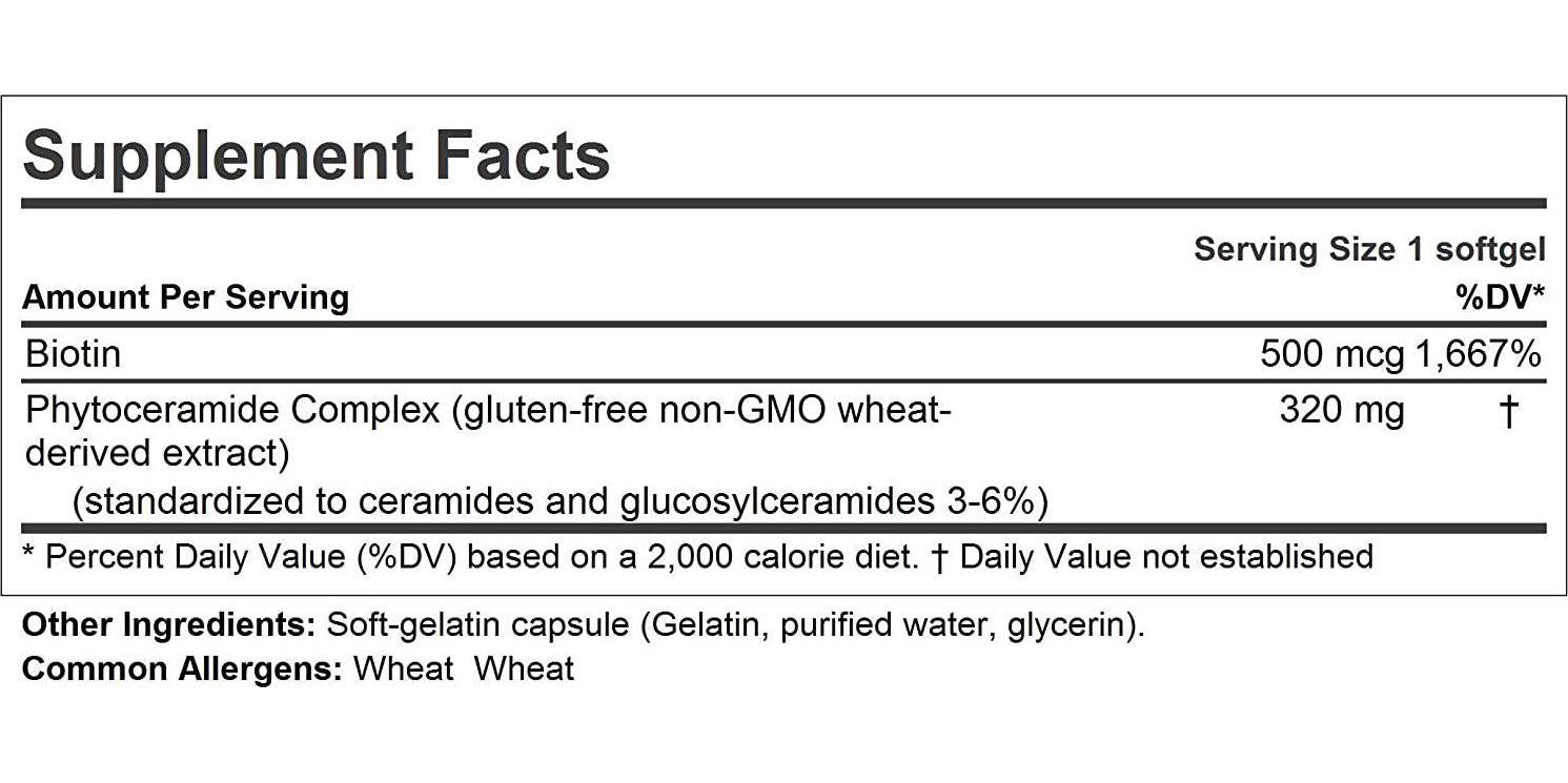 - SUPERIOR 100% PURE BIO ACTIVE INGREDIENTS Provides concentrated levels of Phytoceramide and Biotin. Contains NO Milk / Dairy Free, Gluten Free; NO soy, yeast, corn, sodium, salt, sugar, cholesterol, color, preservative or manufacturing additives.