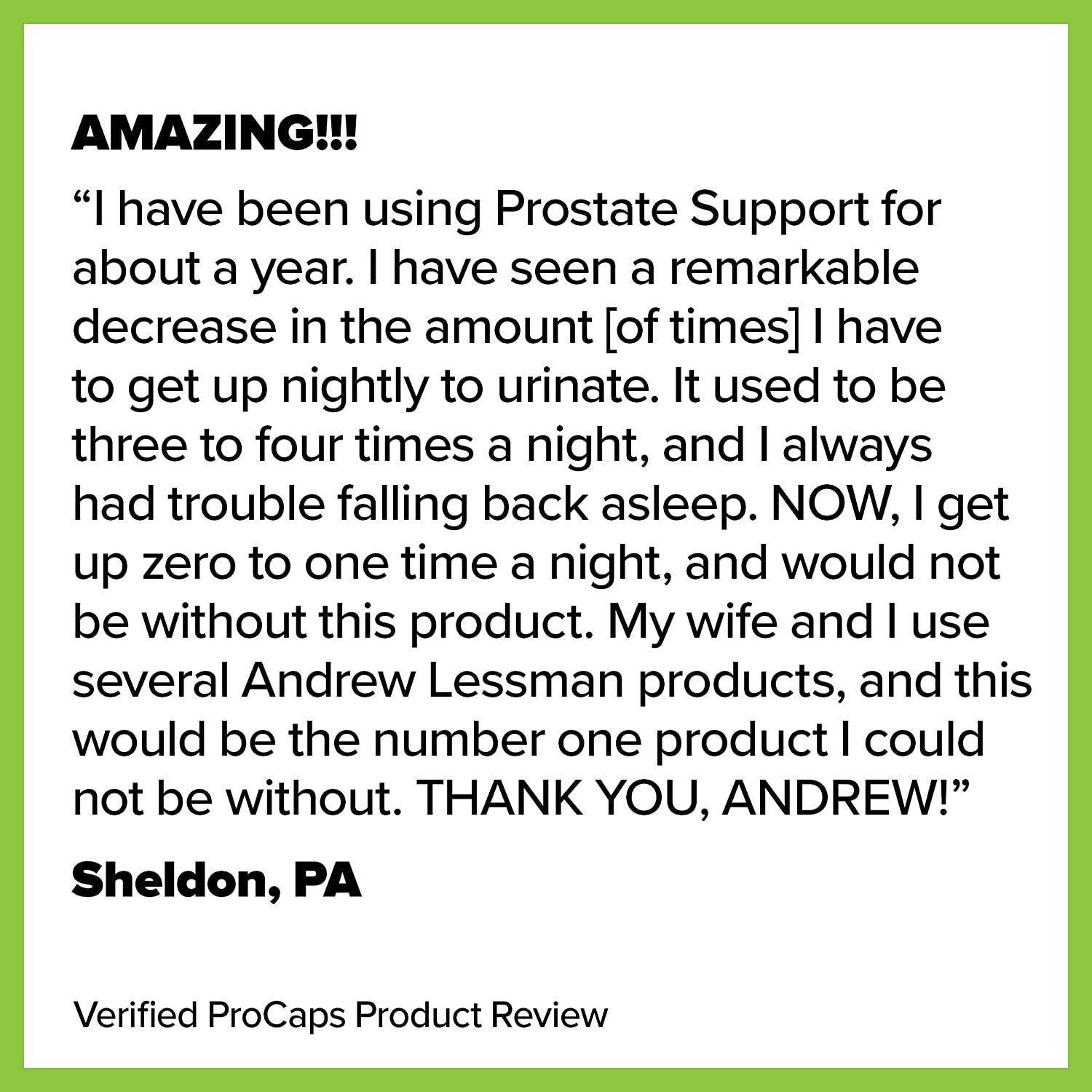Andrew Lessman's PROSTATE SUPPORT contains a high potency, standardized extract of the Saw Palmetto berry. Numerous clinical studies have shown that Saw Palmetto can support the normal function of the prostate and in so doing, promote healthy urinary flow. Saw Palmetto's benefits are most apparent at night where a healthy relationship between the prostate and the bladder can reduce urinary urgency and reduce sleep interruptions. Our Prostate Support provides the ideal research recommended daily level of 320 mg of Saw Palmetto berry extract in a single, easy-to-swallow capsule. Following the science, our high potency extract of the Saw Palmetto berry is standardized to deliver 85-95% total fatty acids. We also include 2,000 mcg of Lycopene, since it is the most important, protective carotenoid in the prostate gland. Research has shown that Lycopene can help protect the prostate from damaging free radicals and promotes healthy prostate function. We then add Pumpkin Seed and Flaxseed oils to optimize this formula's benefits. Most men in the United States have only recently discovered the fragile nature of their prostate - generally due to sleep interruptions caused by urinary urgency. Our Prostate Support formula offers a comprehensive, clinically proven, active ingredient to support the delicate tissues of the prostate gland while also promoting the prostate's healthy relationship to urinary and bladder function. These statements have not been evaluated by the Food and Drug Administration. This product is not intended to diagnose, treat, cure or prevent any disease.