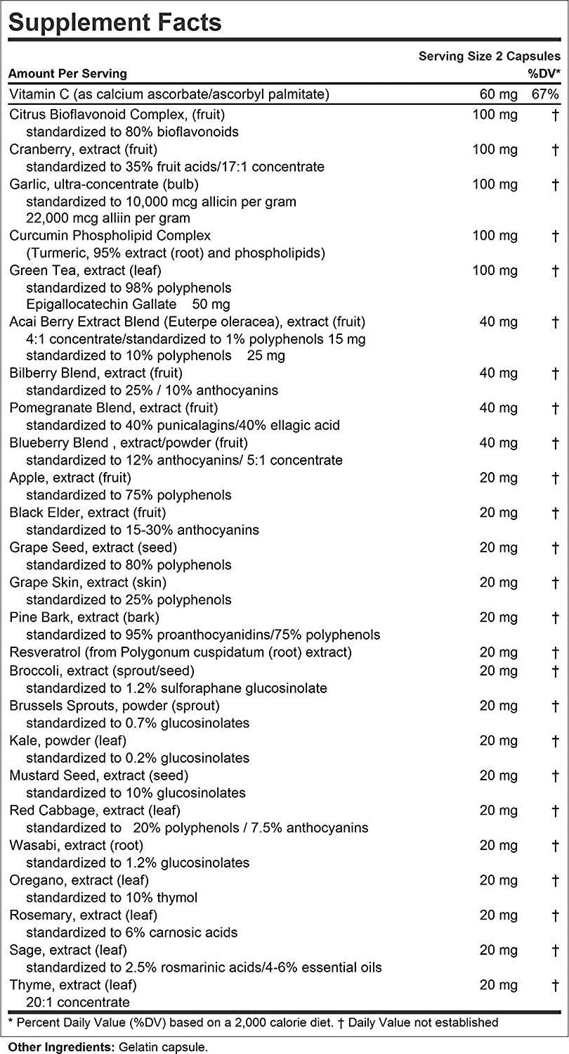 - CONCENTRATED BLEND OF THE KEY INGREDIENTS FROM OUR MOST PROTECTIVE BOTANICAL FORMULAS - A blend of more than 30 standardized extracts from many of the world s healthiest foods. Delivers the most protective polyphenols from Green Tea, Red Wine (Resveratrol) and Pomegranate, a wide array of protective compounds from standardized extracts of richly colored berries, as well as uniquely powerful extracts from Cruciferous Vegetables, along with the well-established benefits of extracts of Spices.