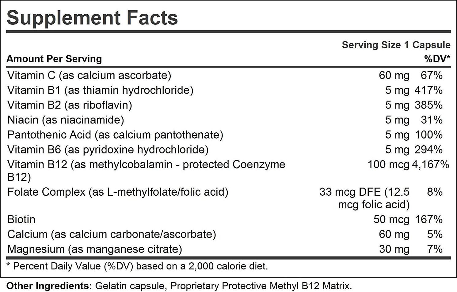 - SUPERIOR 100% PURE BIO-ACTIVE INGREDIENTS – Provides 100 mcg of proprietary protective methyl B12 matrix, Vitamin C, B-complex vitamins, calcium and magnesium. Contains NO Milk / Dairy-Free, Gluten-Free; No soy, yeast, corn, wheat, sodium, salt, sugar, fat, cholesterol, color, preservative, common allergens or manufacturing additives.