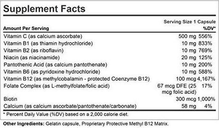 Andrew Lessman's VITAMIN C 500 plus B-COMPLEX is a 100% additive-free, natural complex of Vitamin C plus all the essential B-Complex vitamins, including our unique absorption-protected Methylcobalamin (Natural Coenzyme Vitamin B12), as well as our metabolically active Folic Acid (Methyl Folate). The Vitamin C in this product is entirely in the form of a water-based mineral ascorbate (Calcium Ascorbate), which is entirely non-acidic, so it is guaranteed to not upset your stomach. This special form of Vitamin C promotes the greatest utilization of Vitamin C without the stomach discomfort, loss of potency and rapid nutrient loss associated with ordinary Ascorbic Acid. Vitamin C is a powerful anti-oxidant that supports the health of numerous body tissues and systems. Finally, because they are easily depleted by stress, including illness and strenuous exercise, and are key factors in the metabolism of food and creation of energy in the body, we include high potencies of all of the B-Complex vitamins.