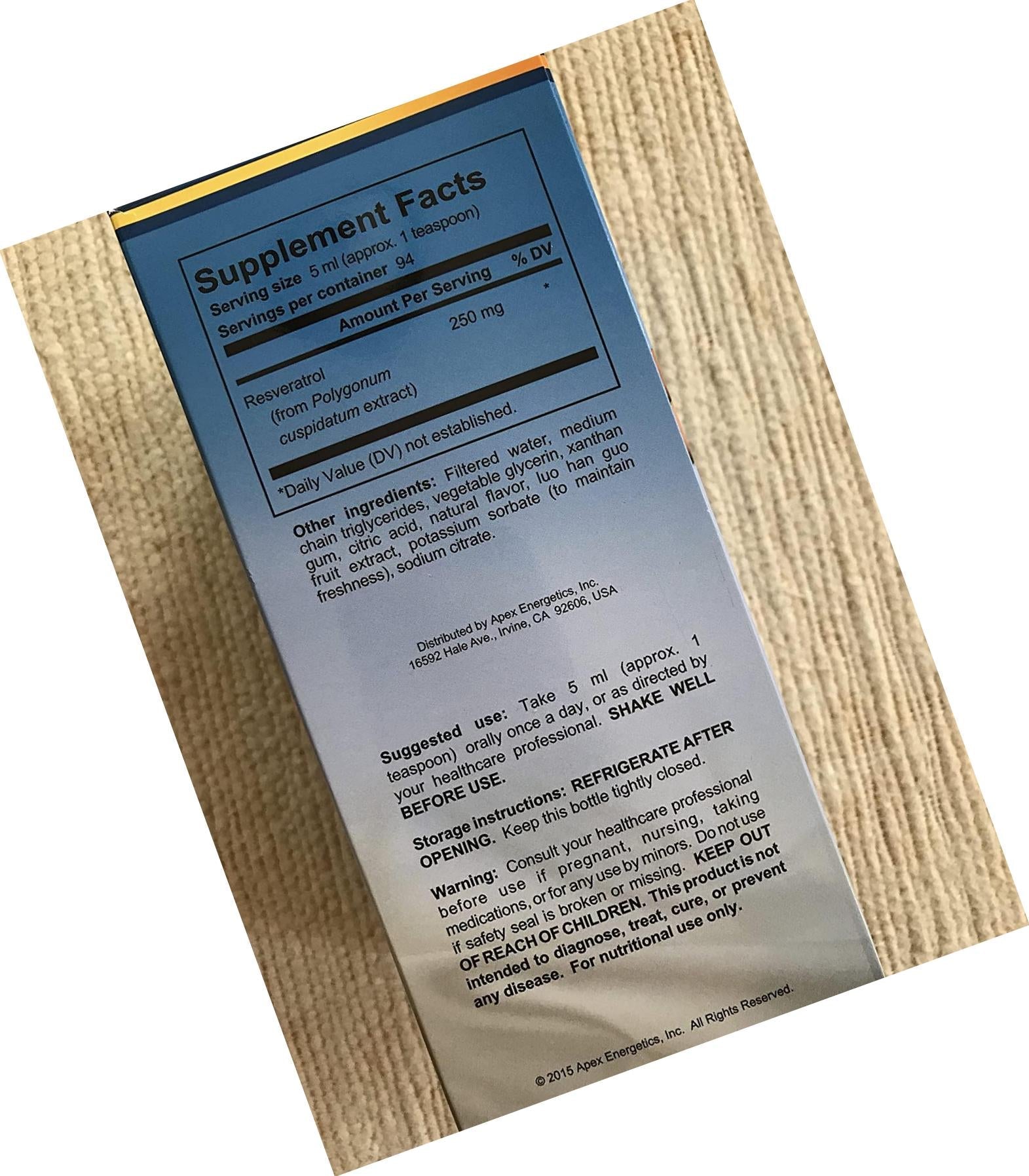 This special product was designed to support the immune system, the gastrointestinal system, and metabolic pathways*. It includes a concentrated source of resveratrol in an emulsified micronized structure with syringe delivery to meet specific serving needs. It includes 250 mg per serving of resveratrol (from Polygonum cuspidatum extract). *This statement has not been evaluated by the Food and Drug Administration. This product is not intended to diagnose, treat, cure, or prevent any disease.