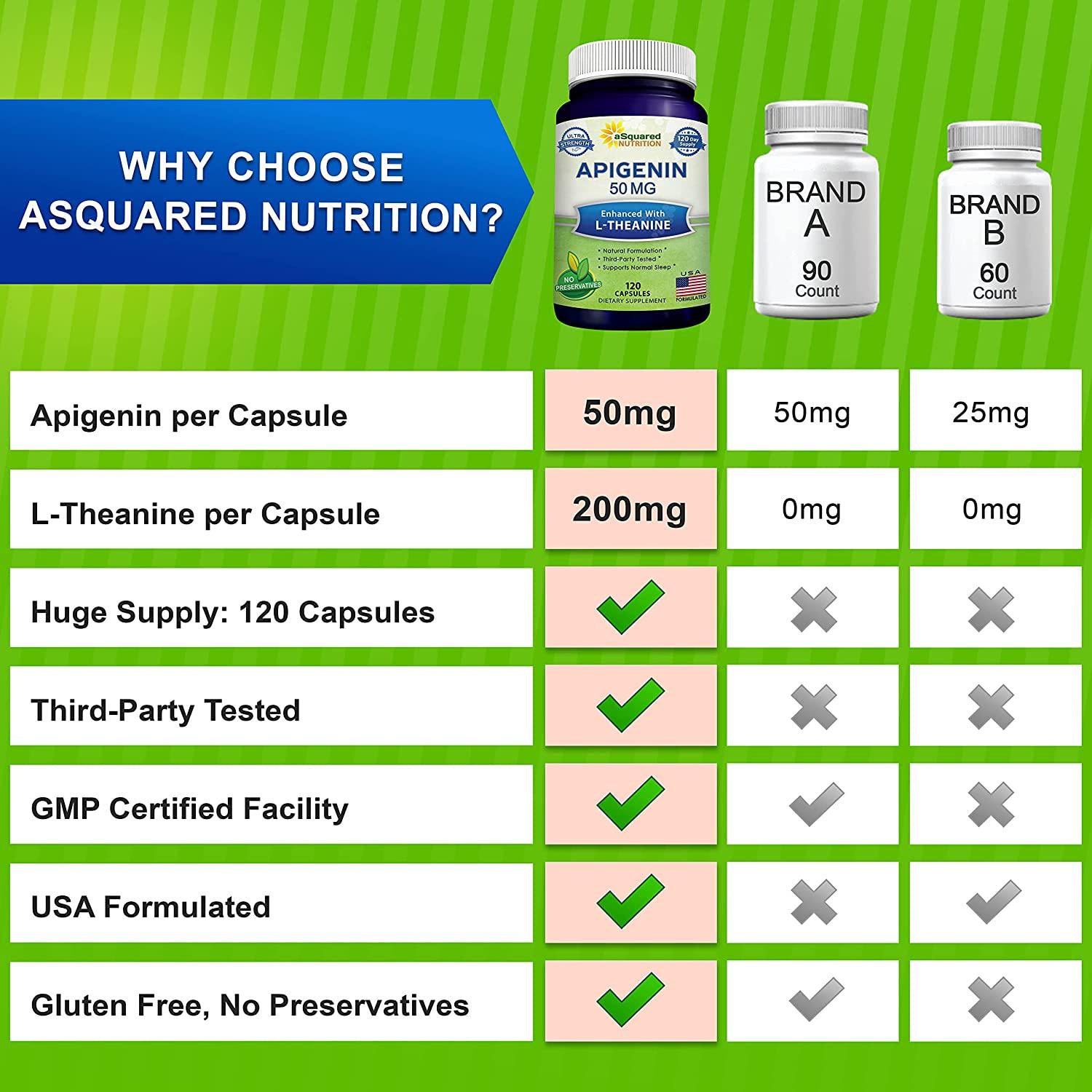 - MAXIMUM STRENGTH FORMULA: aSquared Nutrition s extra strength formula contains 50mg of Apigenin per capsule and is enhanced with 200mg of L-Theanine per capsule. Our plant-based formula contains 120 capsules per bottle for a full 120-day supply. *