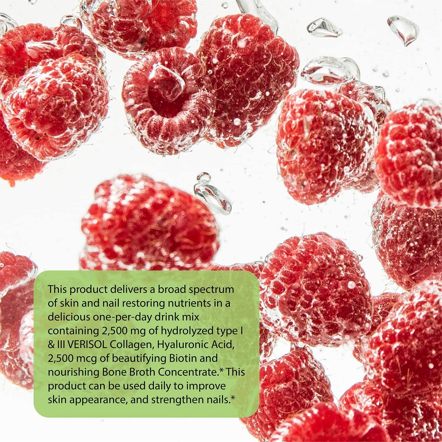 This product delivers a broad spectrum of skin and nail restoring nutrients in a delicious one-per-day drink mix containing 2,500 mg of hydrolyzed type I & III VERISOL Collagen, Hyaluronic Acid, 2,500 mcg of beautifying Biotin and nourishing Bone Broth Concentrate.*