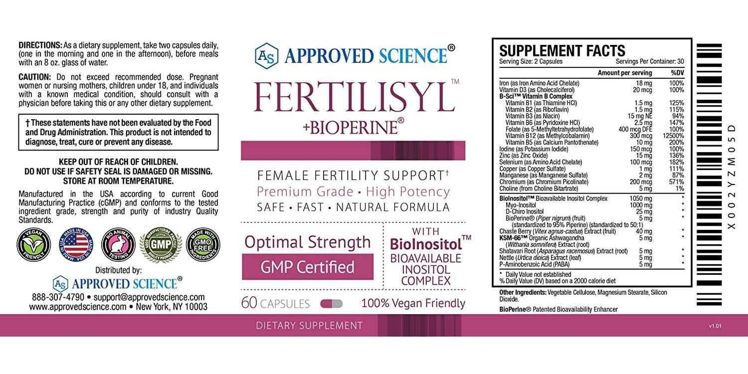 Approved Science Fertilisylis a supplement formulated to help balance female hormones and regulate the menstrual cycle. Prepare the body for pregnancy by promoting healthy follicles and supporting the maturation of eggs. Fertilisyl stimulates the body to produce and utilize progesterone and lowers the risk of infertility/pregnancy loss. This supplement includes Zinc, Copper, Vitamin B12, Iodine, and Manganese, nutrients whose deficiencies negatively impact fertility.