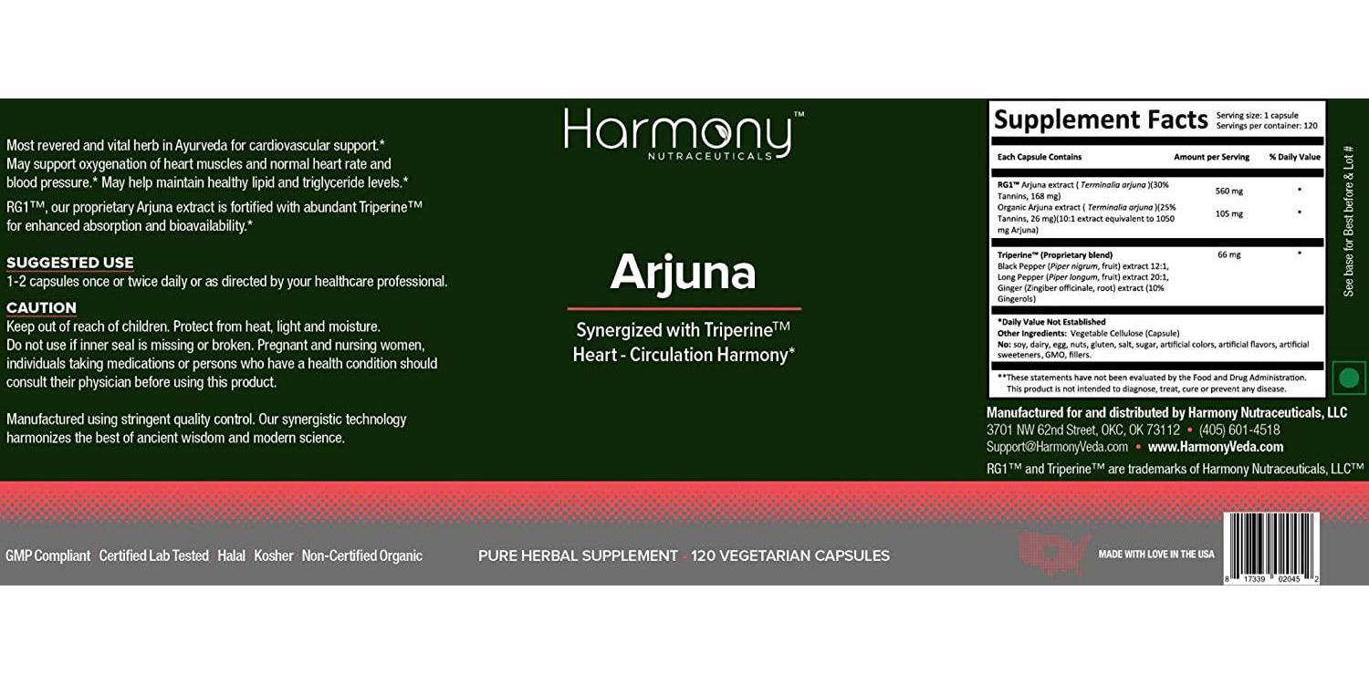 - Most revered and vital herb in Ayurveda for cardiovascular support.* May support oxygenation of heart muscles and normal heart rate and blood pressure.* May help maintain healthy lipids and triglyceride levels.* RG1TM, our proprietary Arjuna extract is fortified with abundant TriperineTM, a synergistic blend of black pepper, ginger and piper longum extracts for enhanced absorption and bioavailability.* Suggested use: 1-2 capsules twice daily before or with meals or as directed by a healthcare pr