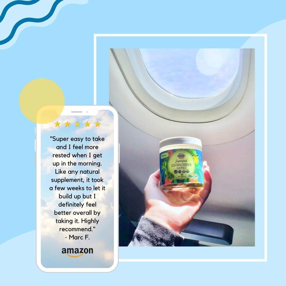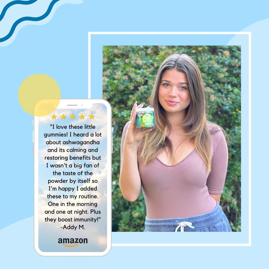 Ashwagandha is an ancient Ayurvedic herb that has been used for thousands of years to naturally calm, heal, and restore the body and mind. ?? Our goal was to use the world's highest quality ashwagandha to create an easy to take superfood gummy that heals, de stresses, and empowers. All of that in just two delicious gummies per day!6 Benefits of Ashwagandha:?? De stresses by lowering cortisol?? Improves sleep quality and promotes calmness?? Supports adrenal and thyroid function?? Boosts brain and memory function by increasing antioxidant activity?? Supports immunity, vitality, and hormonal health?? Improves post exercise recovery and muscle buildingThis powerful adaptogenic herb has been used as a natural sleep aid, mood support supplement, and makes a perfect gift for women and men looking for less stress, increased happiness, and overall calmness. Combined with immune system support, this anti stress gummy is bound to brighten your day and keep you healthy.