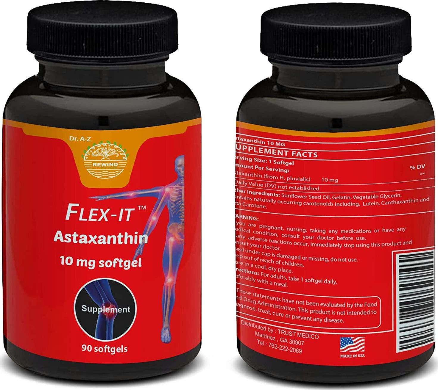 FLEXIT Astaxanthin is well known globally as the authentic Astaxanthin softgel 10mg. FLEXIT Astaxanthin10mg soft gels is Sourced from Microalgae Haematococcus pluvialis Biologically Active Antioxidant Carotenoid and Supports Brain, Eye, Supports good Skin, Heart & Joint Health . Research has shown that consumption of natural astaxanthin may support joint health, cardiovascular health, eye health and healthy immune function. just astaxanthin 12mg This fortified Astaxanthin softgel Capsule is good for brain booster support skin supplement joint supplement immune system support, joint 90 DAYS SUPPLY - Astaxanthin Nutritional Supplements, Premium Antioxidant - One per day - Sports Nutrition & Immunity Supplement - Supports Eye, Joint & Cardiovascular Health. Our Flexit Astaxanthin is recommended for people needing supporting quick recovery from strenuous exercise or physical activity it supports reducing oxidative stress that causes soreness and stiffness . Antioxidant supplement