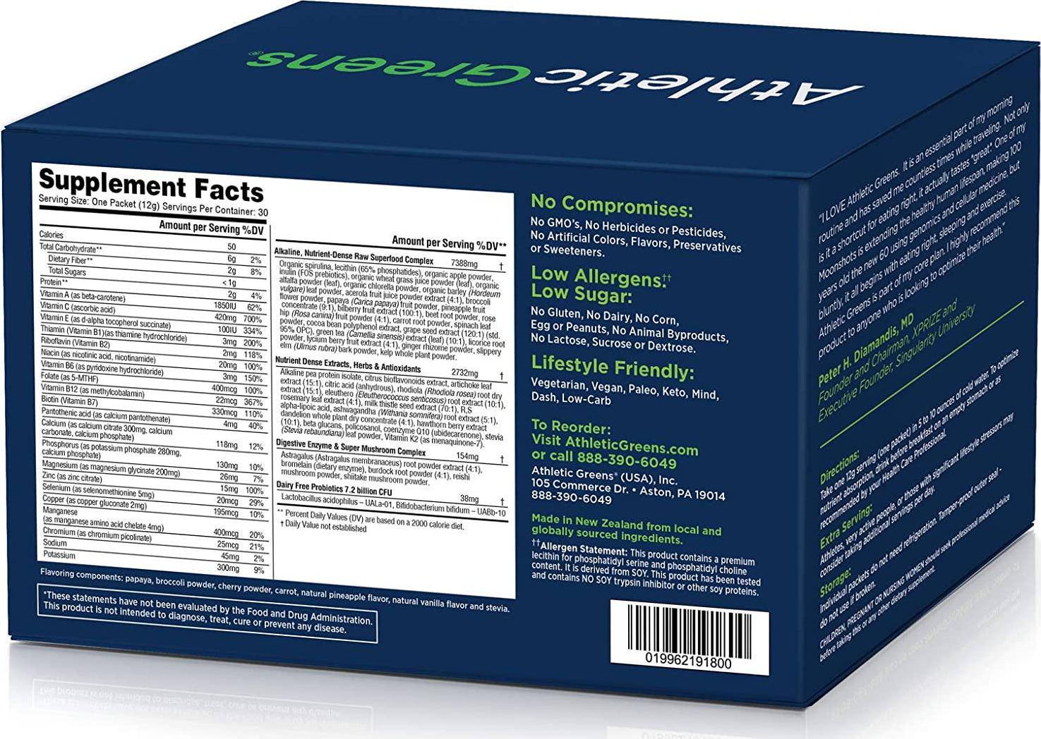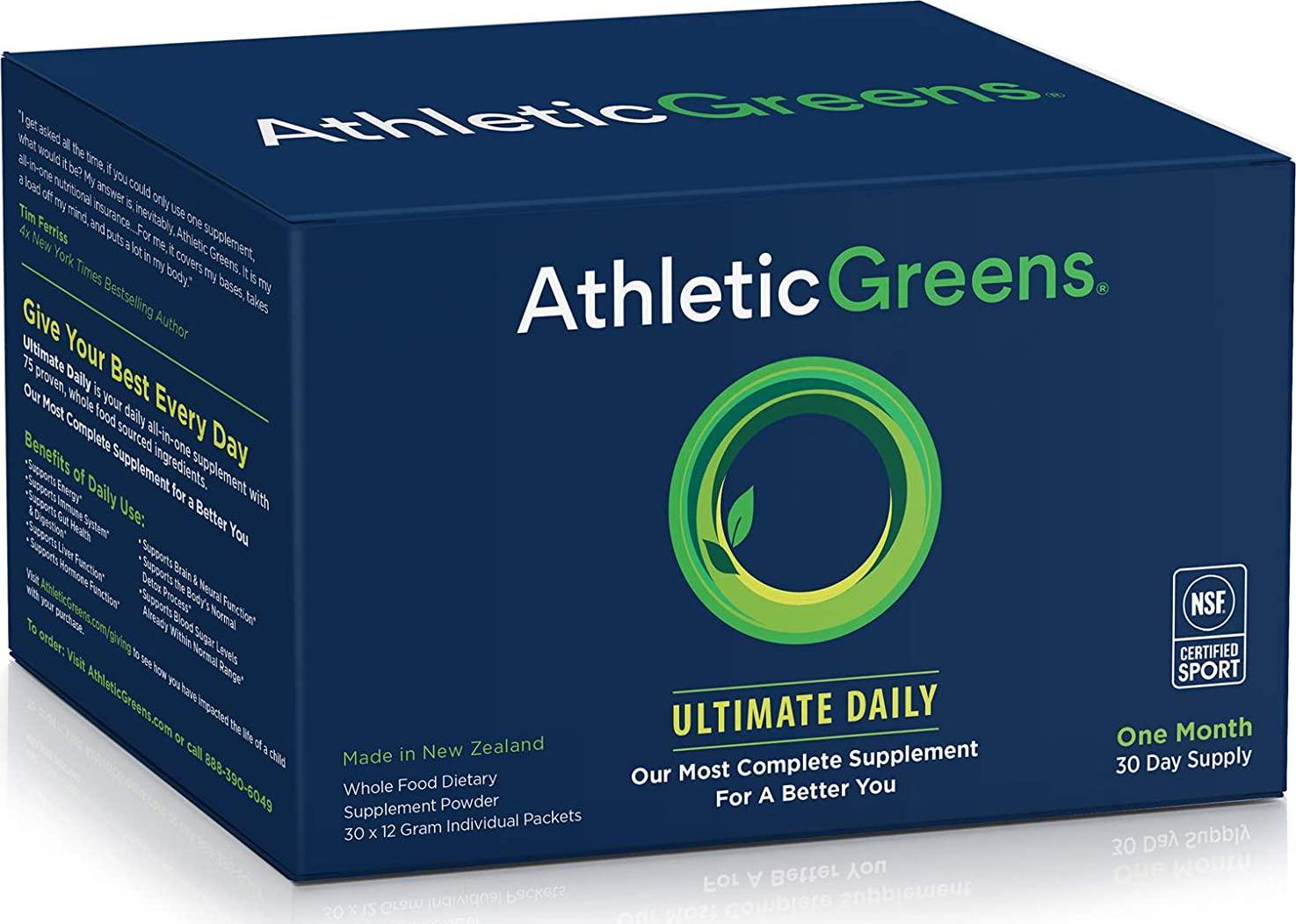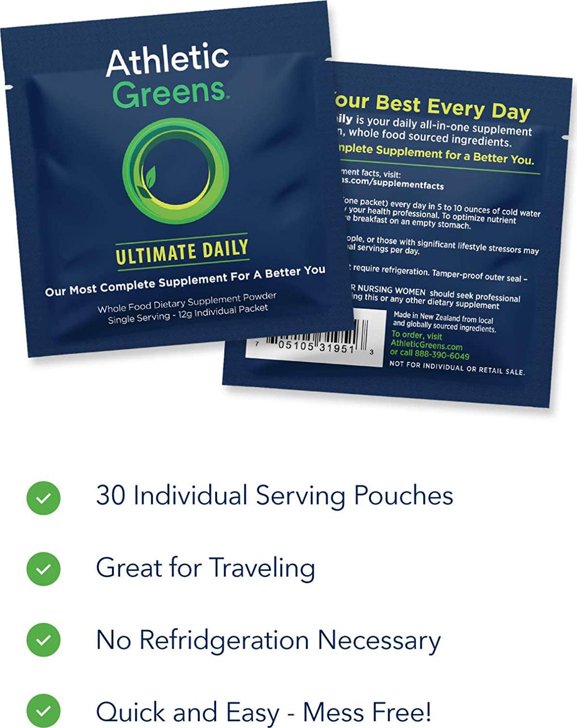 Athletic Greens Ultimate Daily, Whole Food Sourced All in One Greens Supplement, Superfood Powder, Gluten Free, Vegan and Keto Friendly, NSF Certified, Travel Packs (30 Individual Packs)