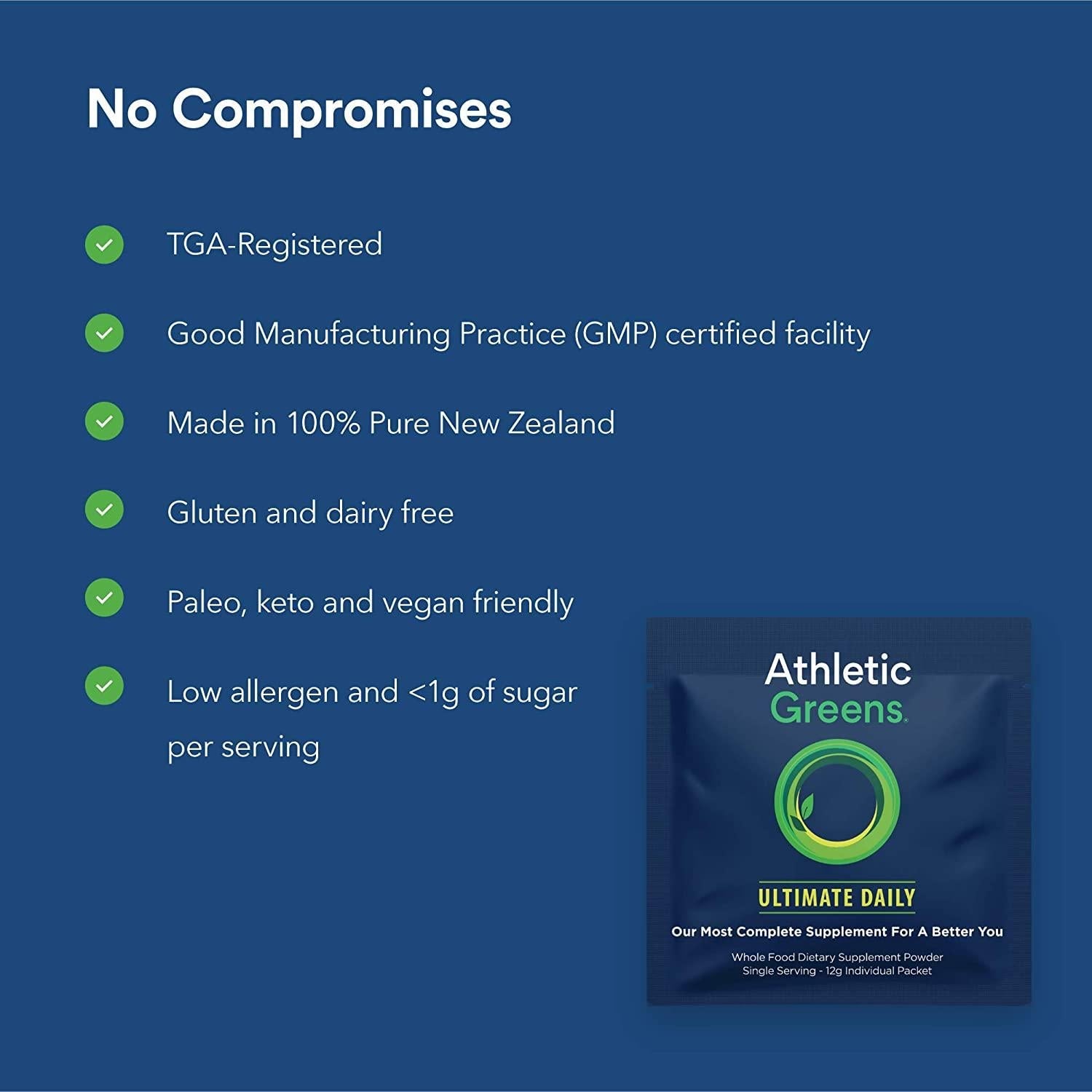 Athletic Greens is the delicious daily habit that sets you up for a healthy future. No other drink or supplement does as much for your body as Athletic Greens: - The antioxidant equivalent of 12 servings of vegetables and fruits in a single serving - 10 years of research and ongoing development - Formulated by nutritionists and doctors - Made in 100% Pure New Zealand - Gluten and dairy free - Paleo, keto and vegan friendly - Low allergen and