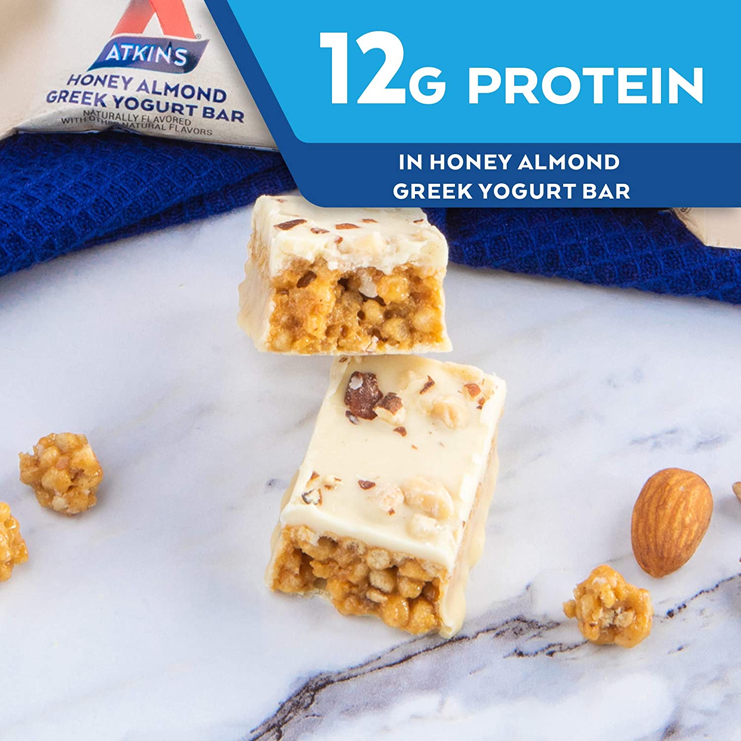- HONEY ALMOND GREEK YOGURT SNACK BAR. Let this Atkins snack bar delight your taste buds while delivering essential vitamins. Includes 6 packs, each with 5 ready-to-eat 1.41 oz bars with B vitamins, protein and fiber, making this snack a convenient and nutritious way to power through your morning and stay satisfied until your next meal