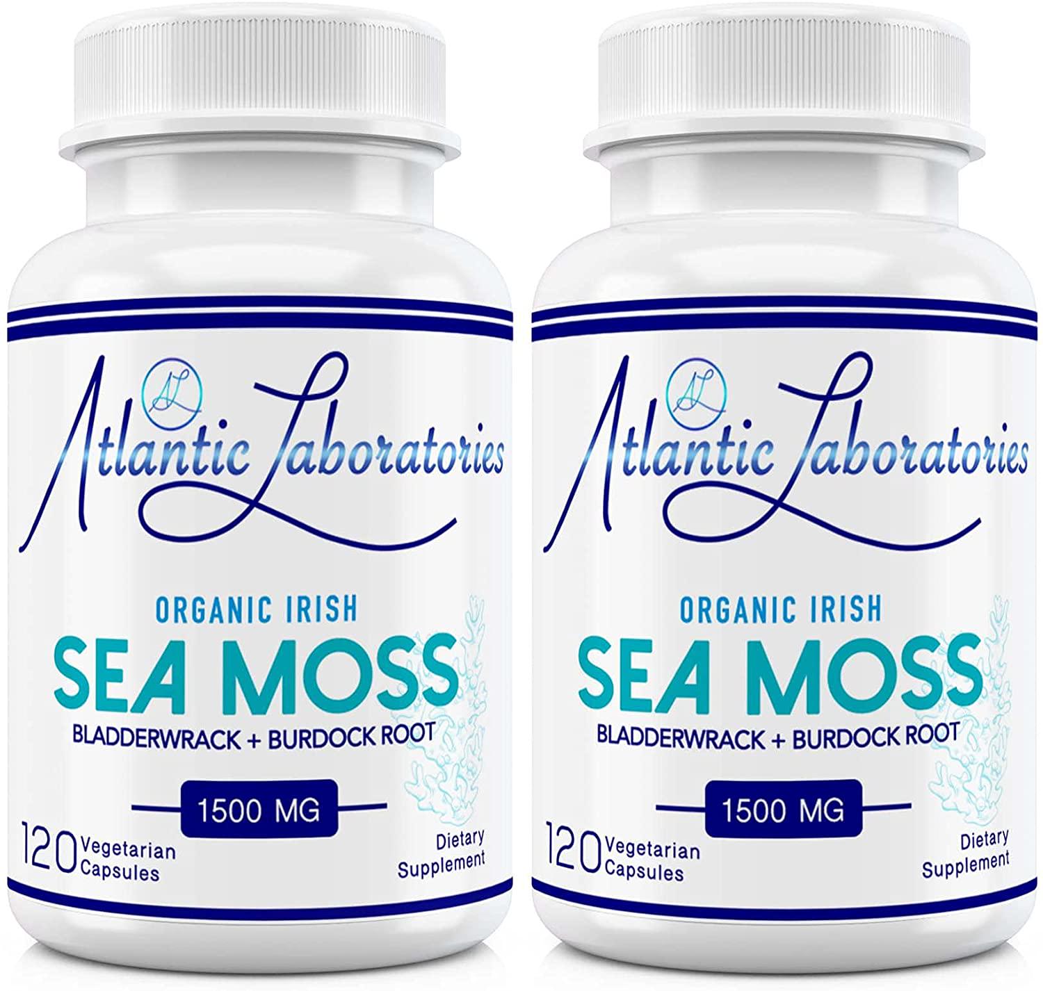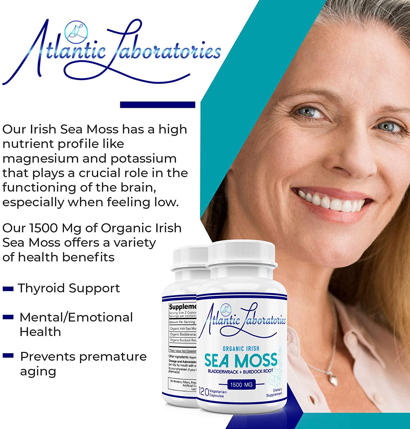 - ORGANIC & WILDCRAFTED - Atlantic Laboratories Organic Sea Moss 1500 MG 120 Ct Wildcrafted Irish Sea Moss, Bladderwrack and Burdock Root Capsules are 100% Natural, Organic, Wildcrafted, Vegan and Filler Free. We give you a nutrient dense way to nourish your body with 92 minerals and immune boosting antioxidants while also aiding in digestion and gut health. This powerful superfood blend makes it a complete full body cellular supplement.