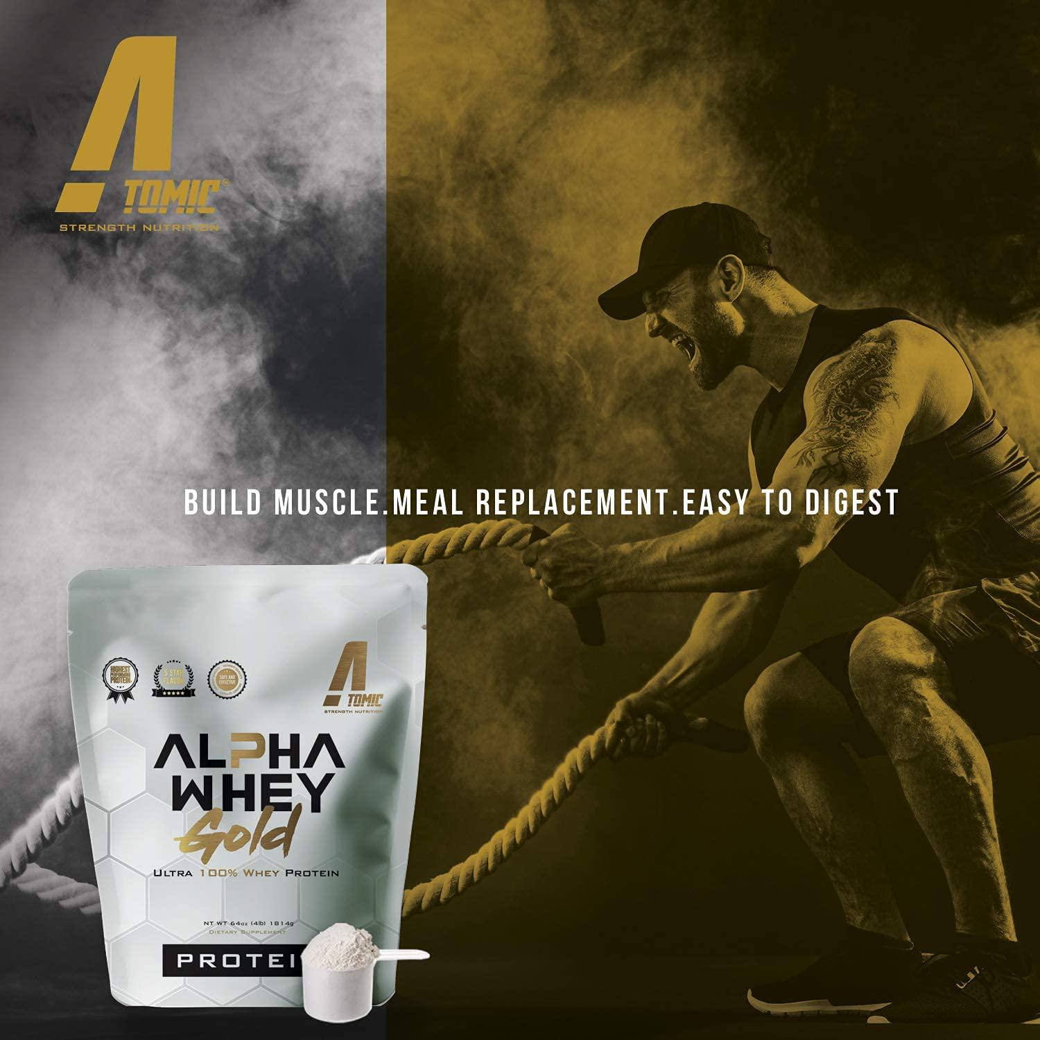 Atomic Strength Nutrition Alpha Whey Gold Ultra 100% Whey Protein Strawberry Easy to Digest Meal Replacement Sugar Free, Fat Free, Gluten Free, Lactose Free 4lb.