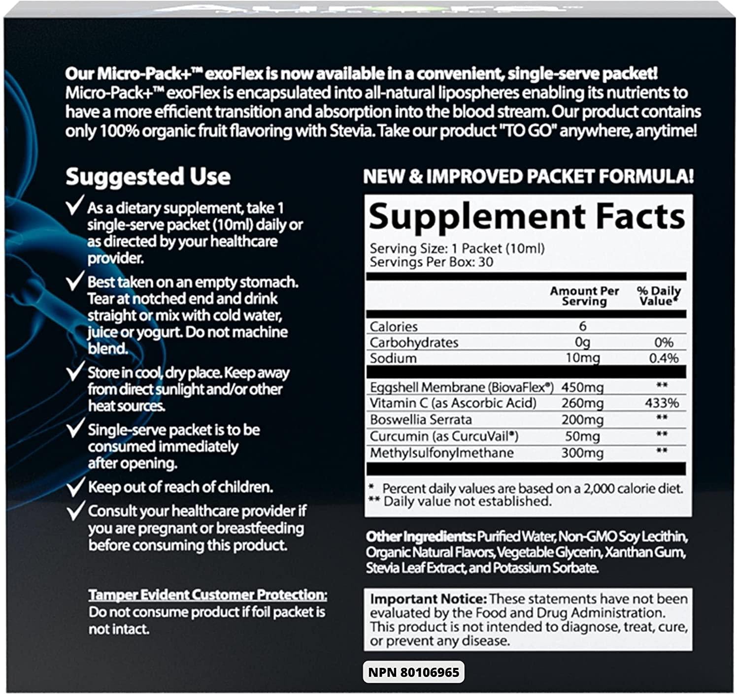 Aurora Nutrascience, Micro-Pack Liposomal ExoFlex+ Vitamin C, Eggshell Membrane with BiovaFlex, Curcumin, and Boswellia, 30 Single-Serve Liquid Packets, 0.34 fl oz (10 ml) Each