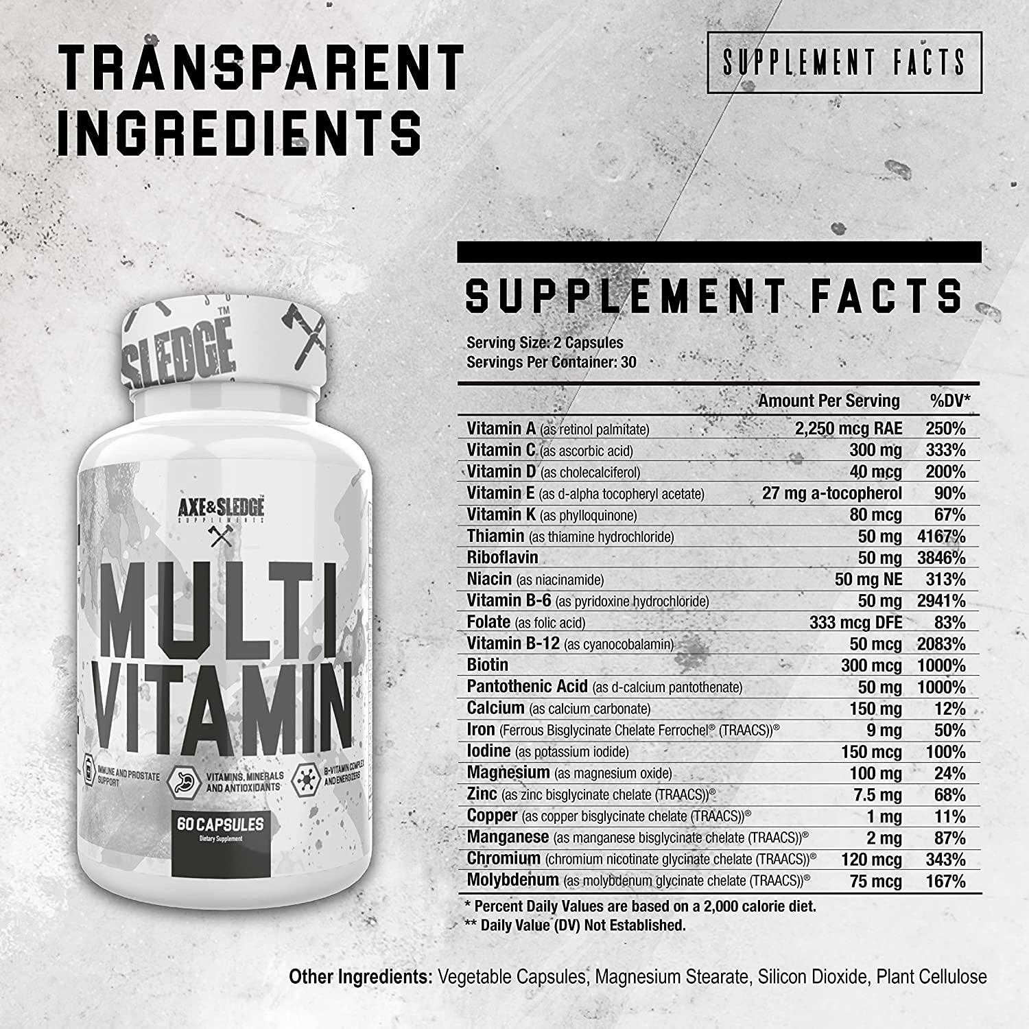 A multivitamin for the hardest workers in the gym! Regardless of how perfect your diet is, consuming enough vitamins and minerals on a daily basis is extremely challenging. Micronutrient deficiencies can wreak havoc on not only your health, but also your performance, ability to lose fat, and gain muscle. Far too often, micronutrients are not prioritized enough. It seems that the majority of people, especially in the fitness industry, are more concerned about their macronutrient and caloric intake, as opposed to their vitamin and mineral intake. Although carbs, fats, protein, and overall calories are what ultimately determines if you lose weight, gain weight, or maintain, micronutrients should never be overlooked regardless of your goal. This is why we recommend sticking to a whole-food-based diet that includes plenty of high-quality nutrient-dense foods. But, even then, you may still be missing out on some essential nutrients, which is why we created the Axe & Sledge Multivitamin! Multivitamins are one of the most common supplements in the industry, however many of them use low-quality forms of vitamins and minerals that are difficult for the body to absorb and utilize. So not only are you wasting money, but youre also not getting the benefits you should be. Axe & Sledge knows that hard-working Mfers deserve more, so we took it upon ourselves to create a premium multivitamin that only uses the highest quality ingredients. The Axe & Sledge Multivitamin features highly bioavailable forms of 22 vitamins and minerals. Each bottle contains 60 capsules, which will last you a full 30-days.