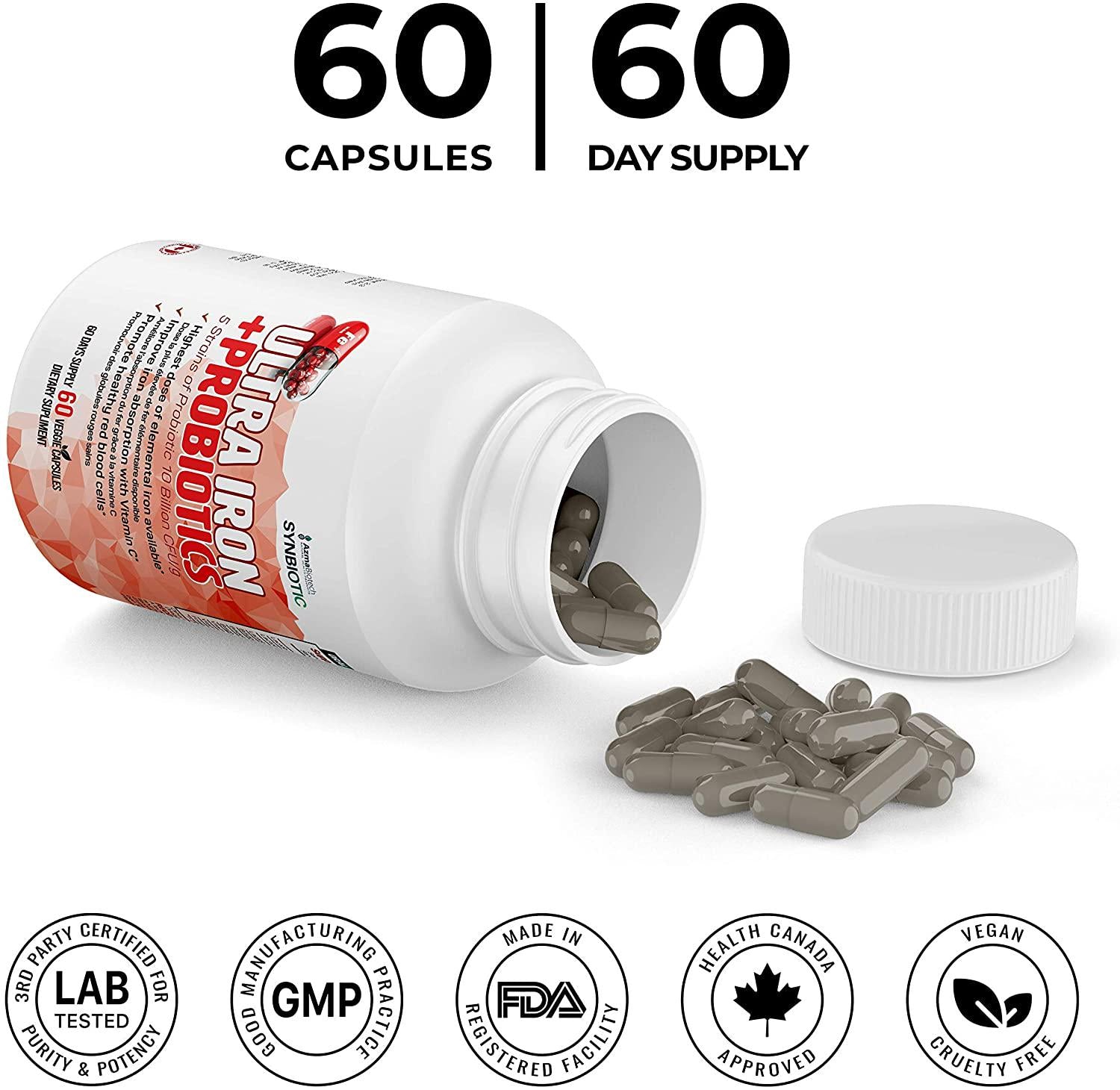 60 veggie capsules, azmabiotech ultra iron, iron supplement, probiotics, vitamin b12, vitamins c