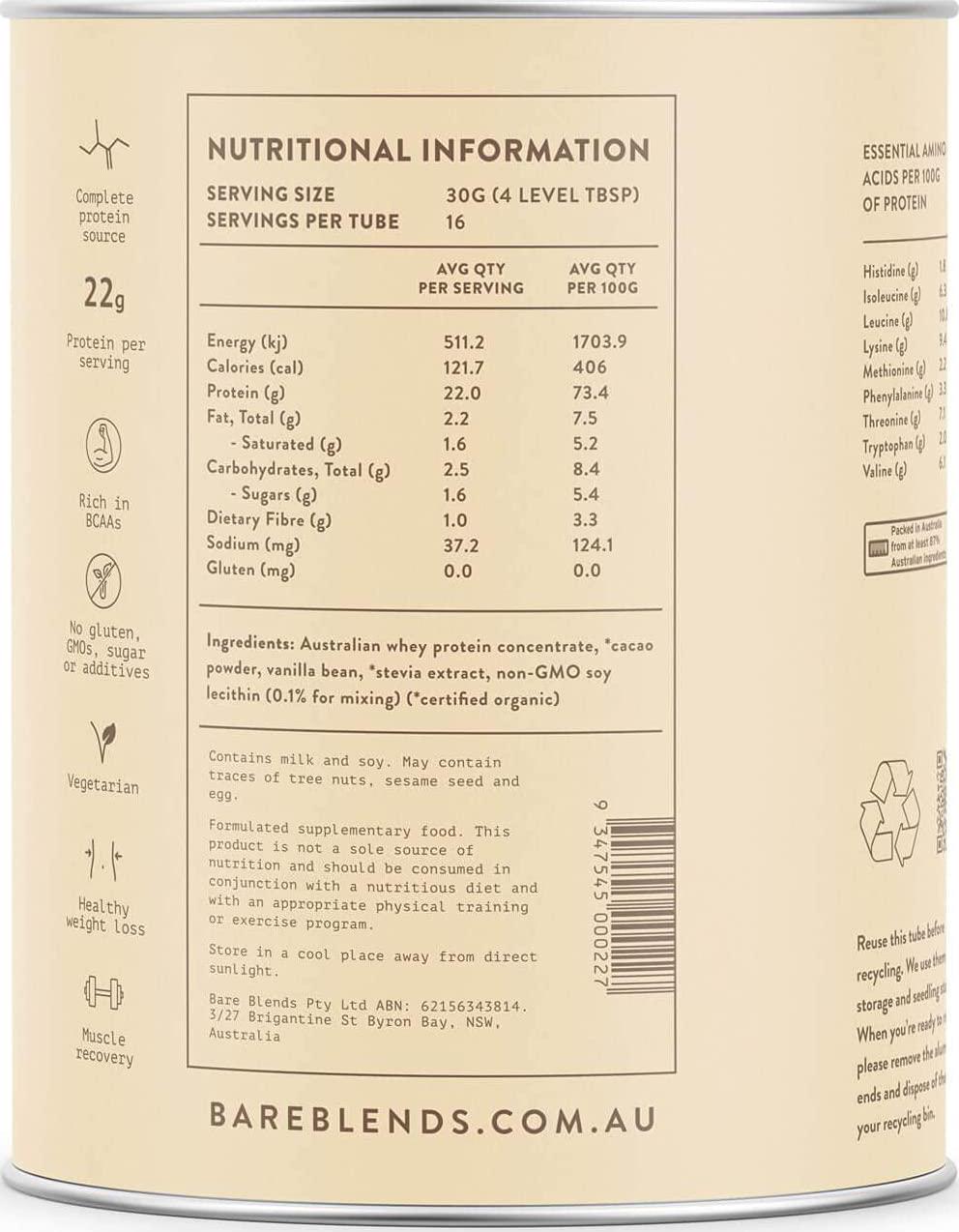 Bare Blends - Natural Whey Protein Concentrate Powder with Raw Cacao | Australian WPC | Chocolate Whey Protein Powder | Gluten Free | non-GMO | 500g