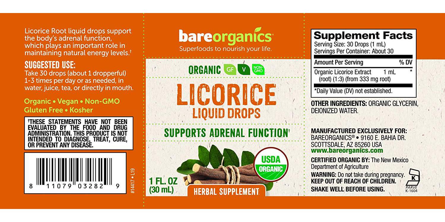 Licorice liquid Drops support the body's adrenal function, which plays an important role in maintaining natural energy levels. BareOrganics Licorice liquid Drops are made with Organic licorice root for optimal wellness support. These liquid Drops are available in a compact vial and do not need to be refrigerated, making them ideal for those with active, on-the-go lifestyles. All BareOrganics Liquid drop formulas are developed without harsh chemicals or ingredients, and are Proudly USDA Organic, Non-GMO, Kosher and Gluten & Alcohol-free.
