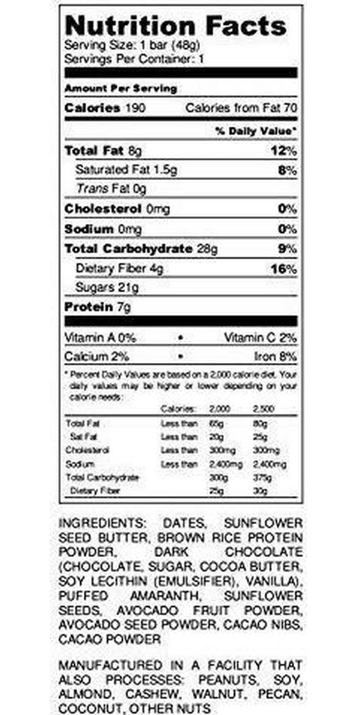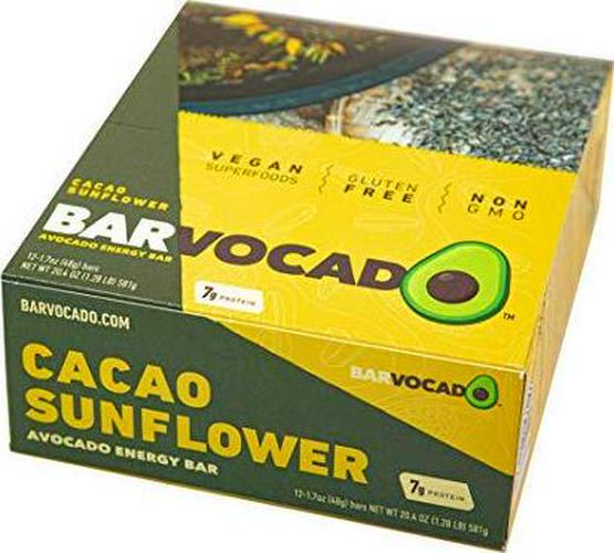 Barvocado Avocado Energy Bars Cacao Sunflower Avocado Vegan Protein Bar 12 Pack - Gluten Free, Non GMO, 7g Protein Bars Avocado, we salute you! You keep us healthy, happy, and smiling. We hope you feel the same about us! We love avocados so much that our Cacao Sunflower energy bars contain an avocado base with a unique blend of sunflower seed butter, cacao nibs, dates, dark chocolate, and brown rice protein powder. Loaded with 7 grams of protein, our Avocado Energy Bars are the perfect grab and go energy bar for heading to the gym, a long day on the trail, cooling down after a yoga session, or simply to satisfy the craving of an avocado!