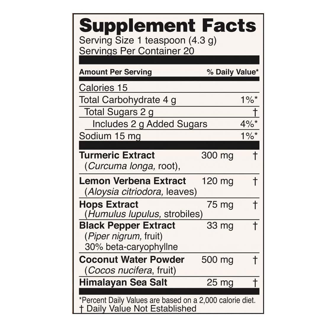 - Formulated with Turmeric, Hops, Black Pepper, and Lemon Verbena.