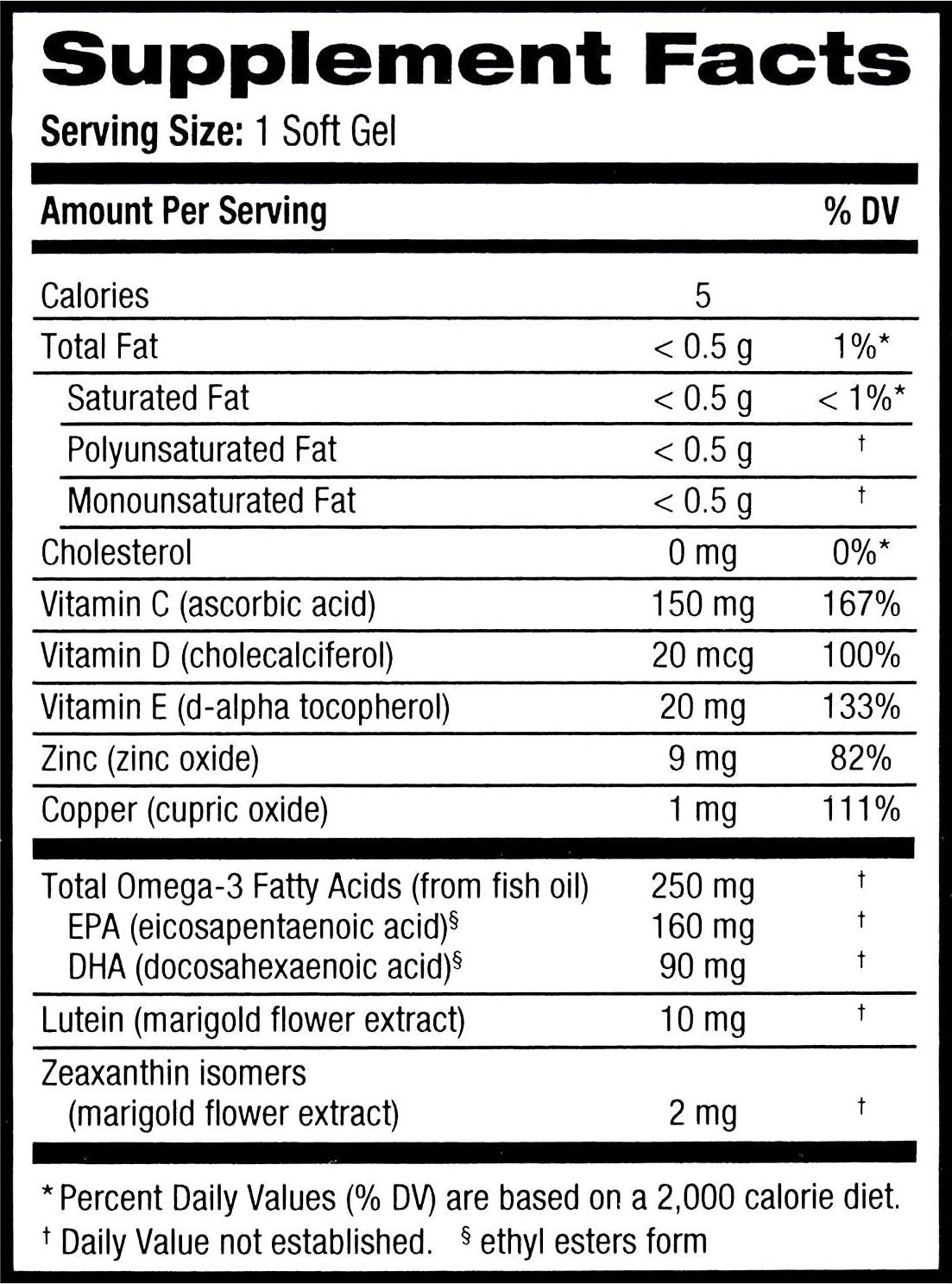 Ocuvite Vitamin and Mineral Supplements are vision and eye supplements that work to improve your eye's health. Ocuvite Pro Performance includes 50 soft gel tablets and is 1 per day doctor recommended. Bausch and Lomb's Ocuvite Vitamin is designed specifically to help protect against the eye stressors of the modern world. Ocuvite Pro Performance contains antioxidants and nutrients, including Vitamin C, D, E, and Zinc, along with Lutein, Zeaxanthin, and Omega to help protect eye health. Bausch and Lomb is committed to research and leadership in ocular nutritionals.