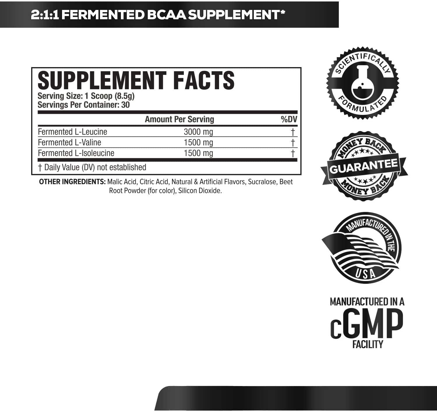 - 2:1:1 FERMENTED BCAA SUPPLEMENT. Jacked Factory BCAAs are the ultimate workout supplement, featuring vegan fermented BCAAs that mix instantly and taste delicious! Each serving provides 6000mg of 2:1:1 branched-chain amino acids to help athletes, bodybuilders, gym-goers, and fitness enthusiasts support muscle recovery, reduce muscle tissue breakdown, and enhance performance.