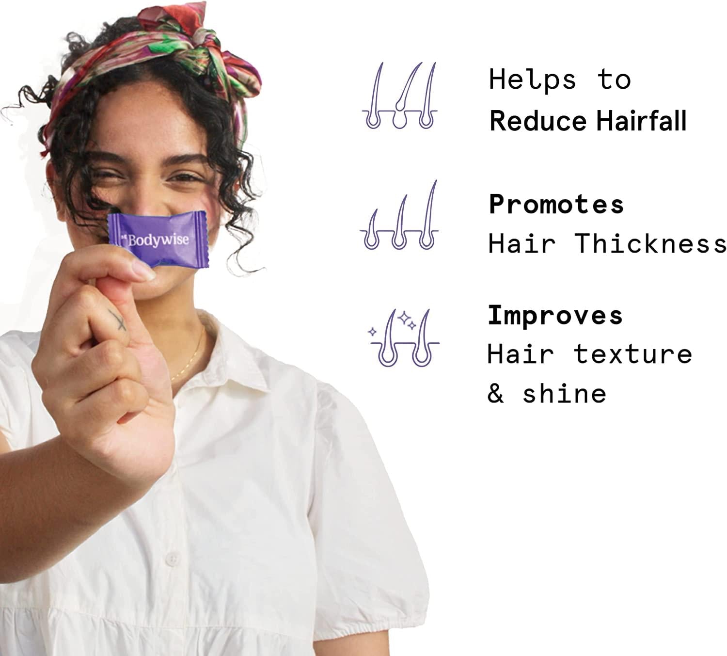 Biotin promotes strengthening of hair. Hair needs nutrients Biotin, Zinc, and Multivitamins. In the form of yummy chewables, here are 120 gummies packed with essential nutrients to strengthen your hair. These hair gummies contain hair multivitamins such as Vitamin A, Vitamin C & Vitamin E that protect your hair from free-radical damage. Multivitamin gummies ensure the removal of hair blockage and the supply of essential hair vitamins for women. 100% Vegetarian Delicious Gummy with a unique blend consisting of Biotin.