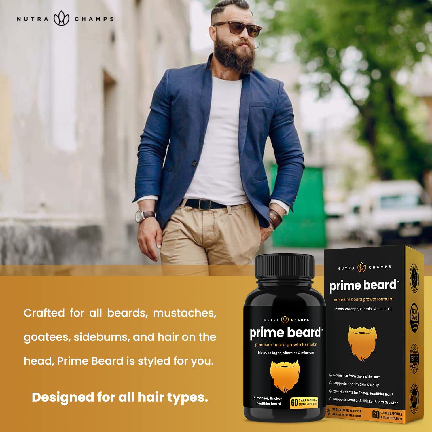 - Premium Formula, Natural Ingredients - Prime Beard is a scientifically designed hair growth supplement that helps you achieve the beard of your dreams. Crafted for all beards, mustaches, goatees, sideburns, and hair on the head, Prime Beard is styled for you. With 20 essential proteins, vitamins, minerals, and herbs for beard & hair health, you’ll be going prime in no time.