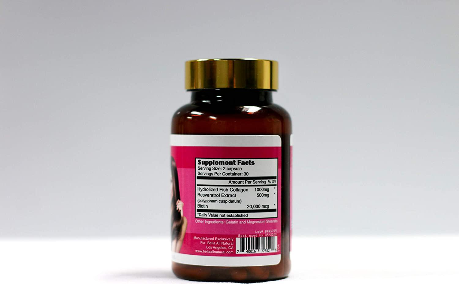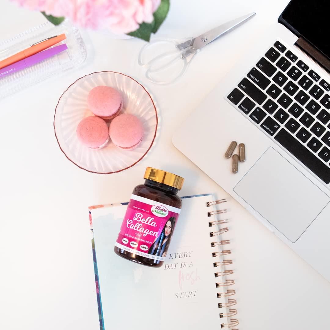 Bella All Natural Collagen with Biotin and Resveratrol - Hair, Skin and Nails Vitamins - 60 Capsules