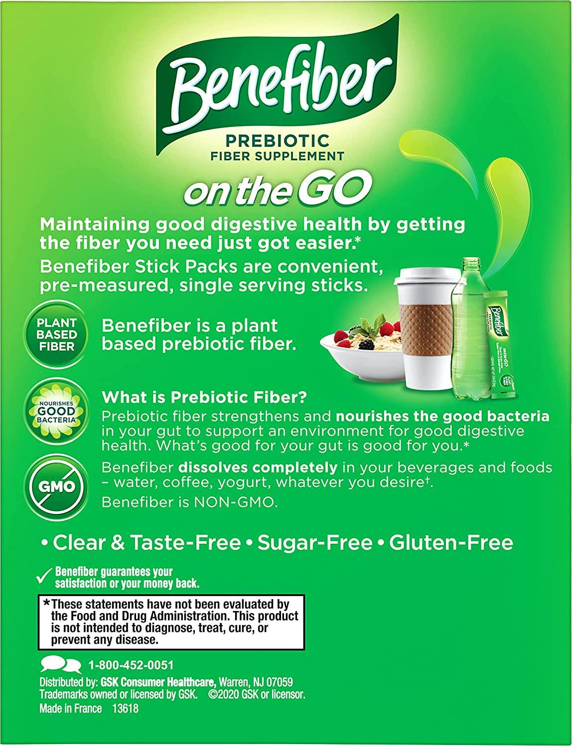 - Two packages of 36 unflavored powder stick packs of Benefiber On the Go Prebiotic Fiber Supplement Powder for Digestive Health, Daily Fiber Powder