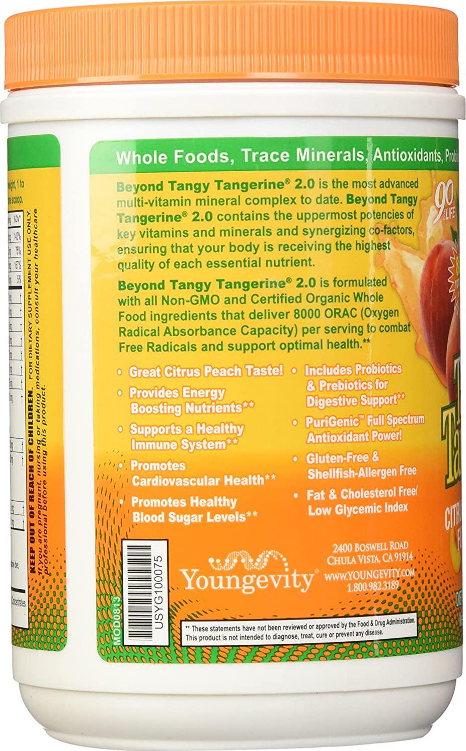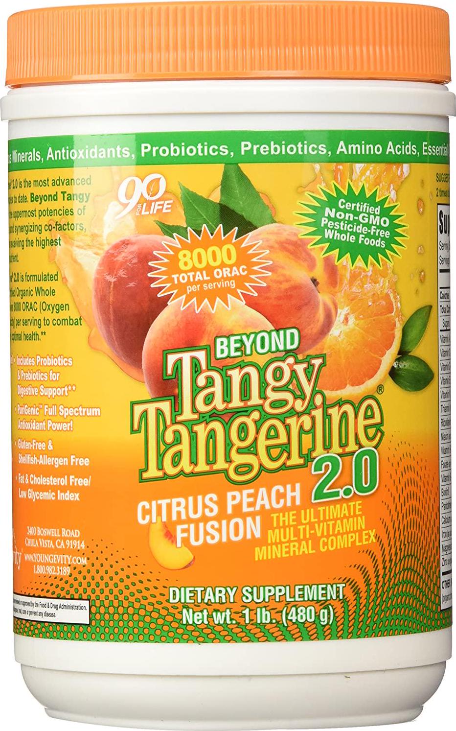 With over 8000 ORAC, certified organic ingredients, and synergizing cofactors to maximize vitamin and mineral uptake, Beyond Tangy Tangerine 2.0 is the most advanced multi-vitamin mineral complex on the market. Beyond Tangy Tangerine 2.0 provides you with: energy boosting nutrients, PuriGenicTM antioxidant support, PreProTM prebiotic and probiotic blend, over 500(#)mg of natural amino acids, and increased potencies of most vitamins and minerals for optimal wellness.
