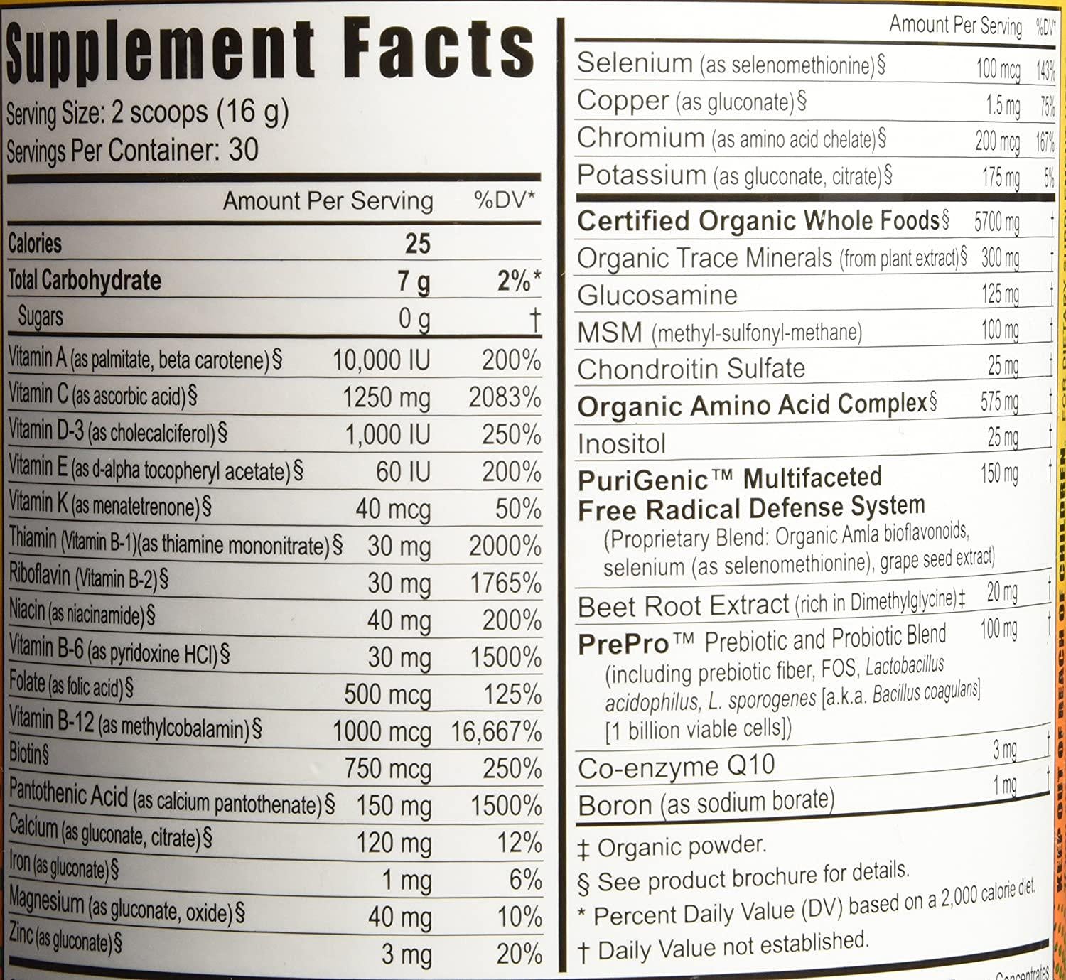 - Contains whole foods, plant derived minerals, antioxidants, prebiotics, probiotics, amino acids, essential co-factors and more
