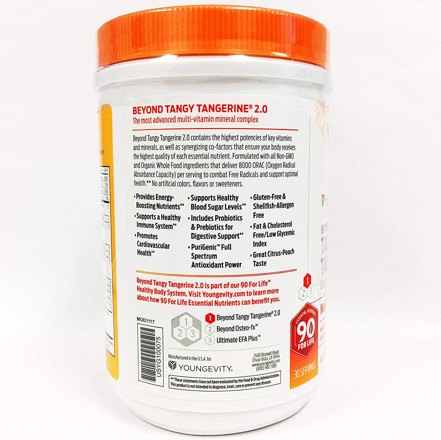 With over 8000 ORAC certified organic ingredients and synergizing cofactors to maximize vitamin and mineral uptake Beyond Tangy Tangerine 2.0 is the most advanced multi-vitamin mineral complex on the market. Beyond Tangy Tangerine 2.0 provides you with energy-boosting nutrients PuriGenic antioxidant support PrePro prebiotic and probiotic blend of over 500()mg of natural amino acids and increased potencies of most vitamins and minerals for optimal wellness.