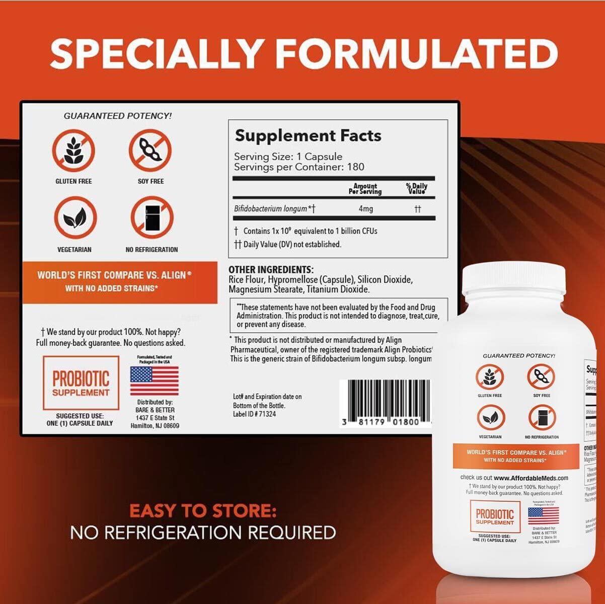 - COMPARE VS ALIGN: Each capsule contains 4mg of the probiotic bifidobacterium. NO other probiotic strains added!